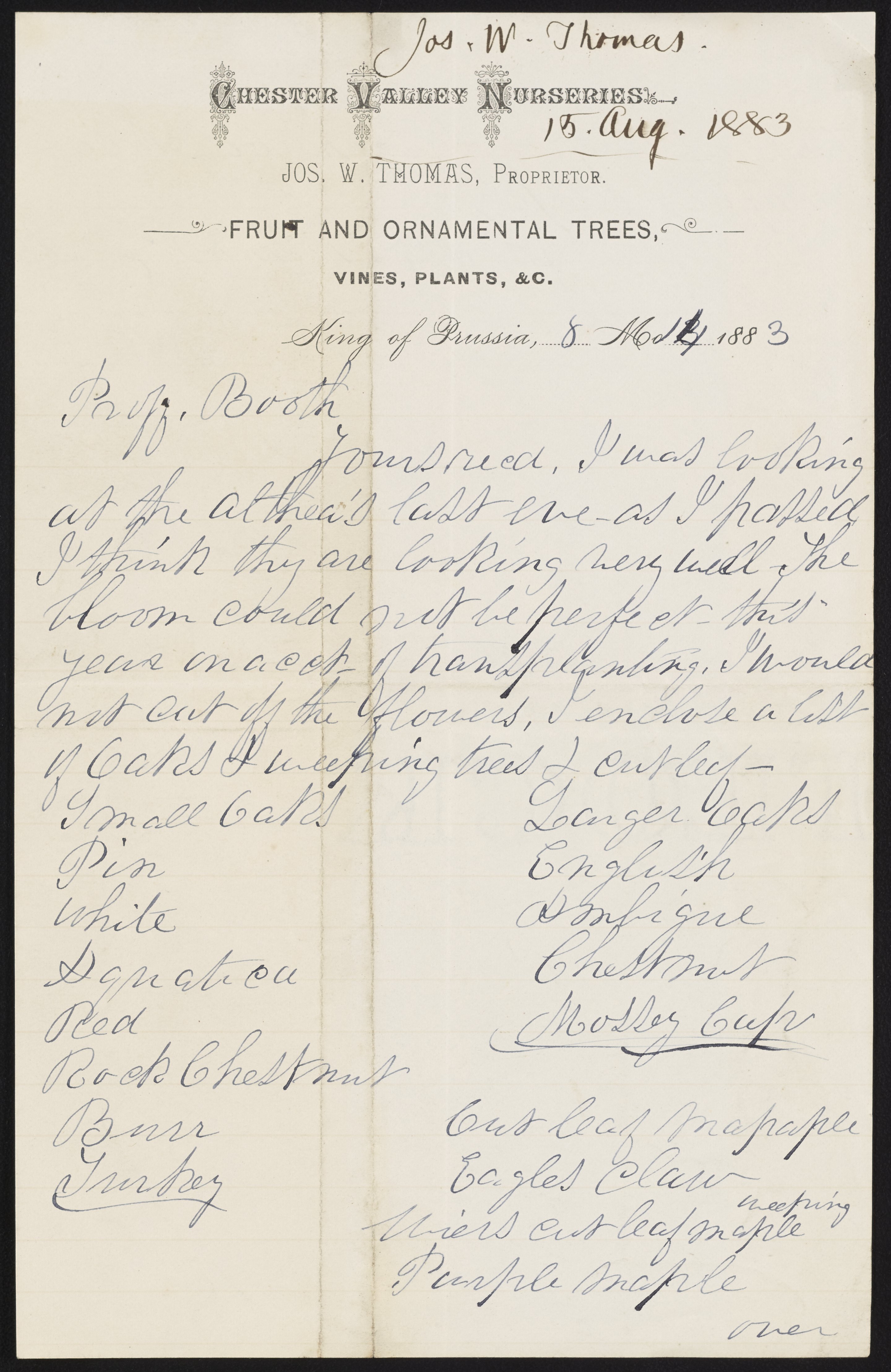 Thomas, Joseph W. “Letter from J.W. Thomas to James Curtis Booth, August 14, 1883,” August 14, 1883. Papers of James Curtis Booth, Box 2, Folder 10. Science History Institute. Philadelphia. https://digital.sciencehistory.org/works/nqrtps3.