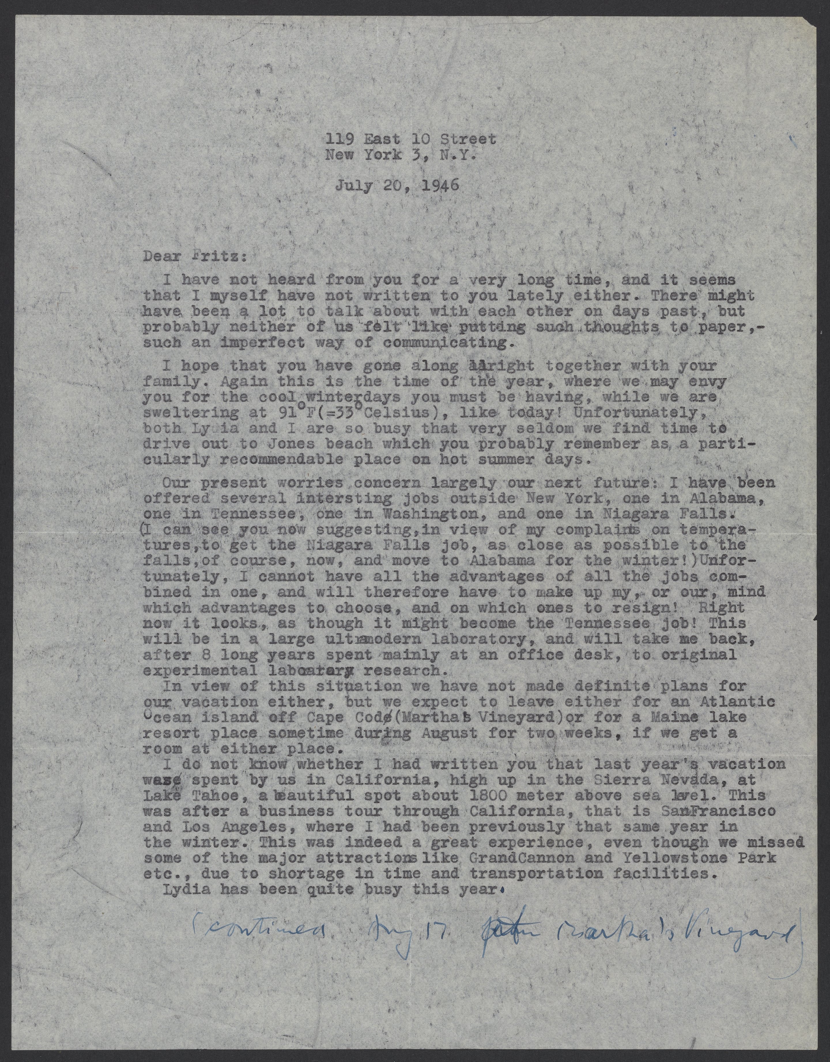 Max Albert Bredig (1902-1977) writes to Fritz (Federico) Schnell. Bredig updates Fritz about his job and his personal life. Bredig mentions that he has been offered positions outside of New York and discusses the pros and cons of each potential job.