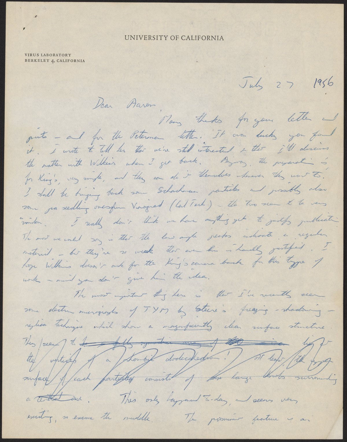 Letter from Rosalind Franklin to Aaron Klug, July 27, 1956