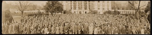 Sepia-toned panoramic photograph of President Calvin Coolidge (1872-1933) standing with members of the American Chemical Society on the White House lawn.
