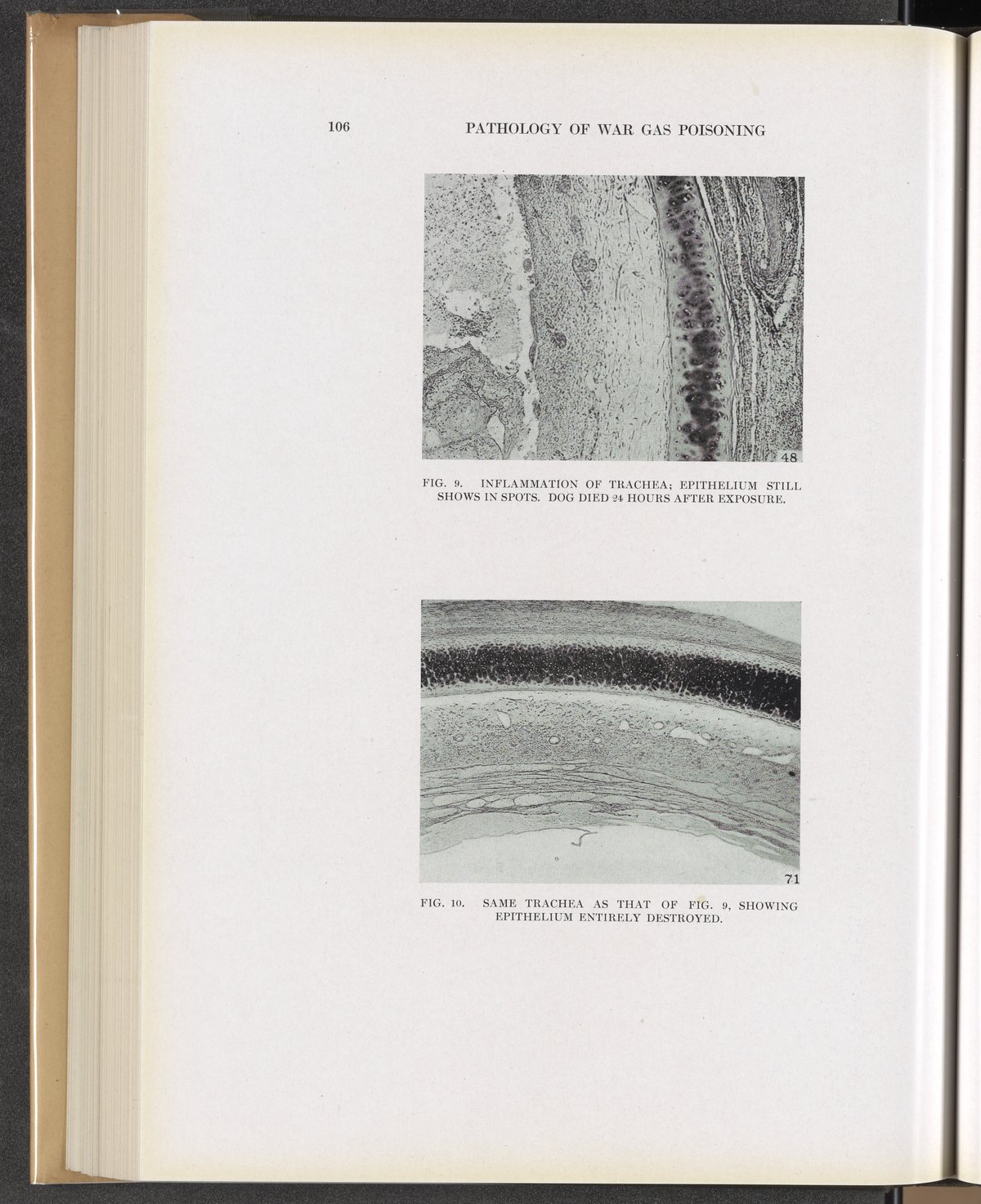 Winternitz, M. C. (Milton C.). “Fig. 9: Inflammation of Trachea; Epithelium Still Shows in Spots. Fig. 10: Same Trachea as That of Fig. 9, Showing Epithelium Entirely Destroyed.” Collected Studies on the Pathology of War Gas Poisoning. New Haven, Connecticut: Yale University Press, 1920. https://digital.sciencehistory.org/works/nv9353006.