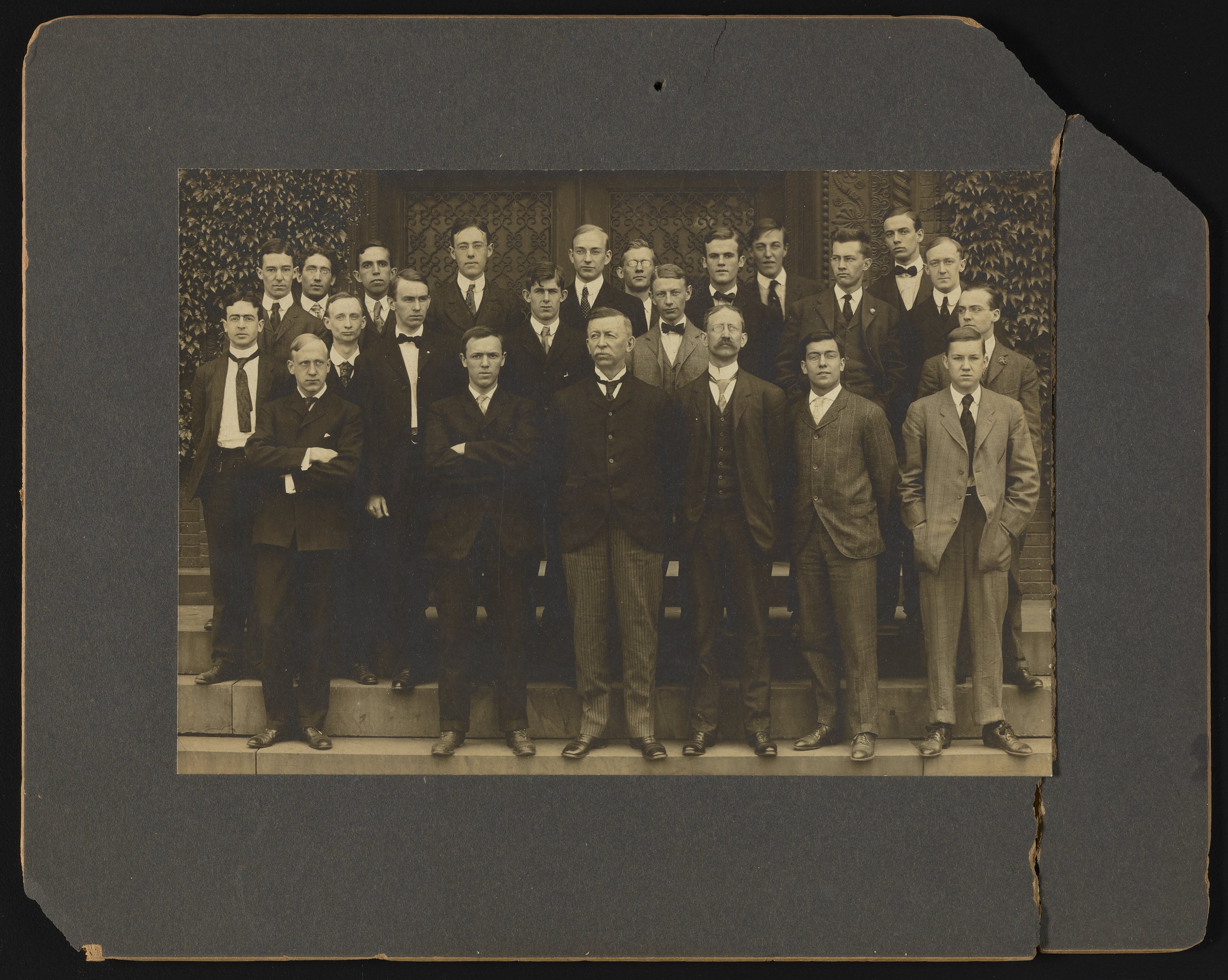 Group portrait of chemist and educator Edgar Fahs Smith (1854-1928) and University of Pennsylvania students posed in front of what is believed to be the Harrison Chemical Laboratory building. Over the course of his career, Smith (center, front row) served as professor of chemistry, vice provost, and provost at the University of Pennsylvania. Deeply concerned with the preservation of chemical history, Smith also amassed a collection of over 1,000 books on alchemy and chemistry, as well as numerous portraits, prints, engravings, autographed letters, and manuscripts, that make up the Edgar Fahs Smith Memorial Collection in the History of Chemistry housed at the University of Pennsylvania.