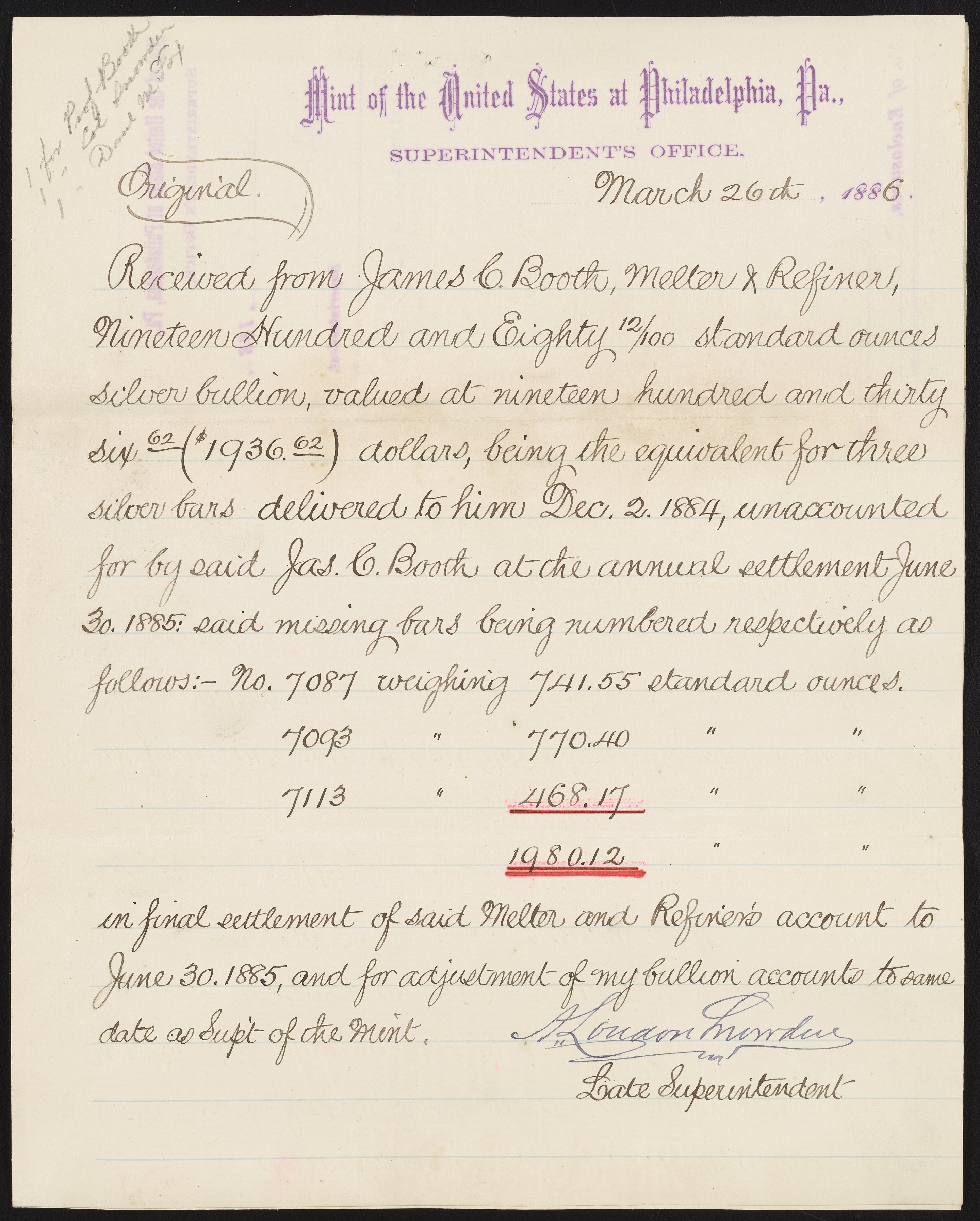 Letter from A. L. Snowden to James Curtis Booth, March 26, 1886