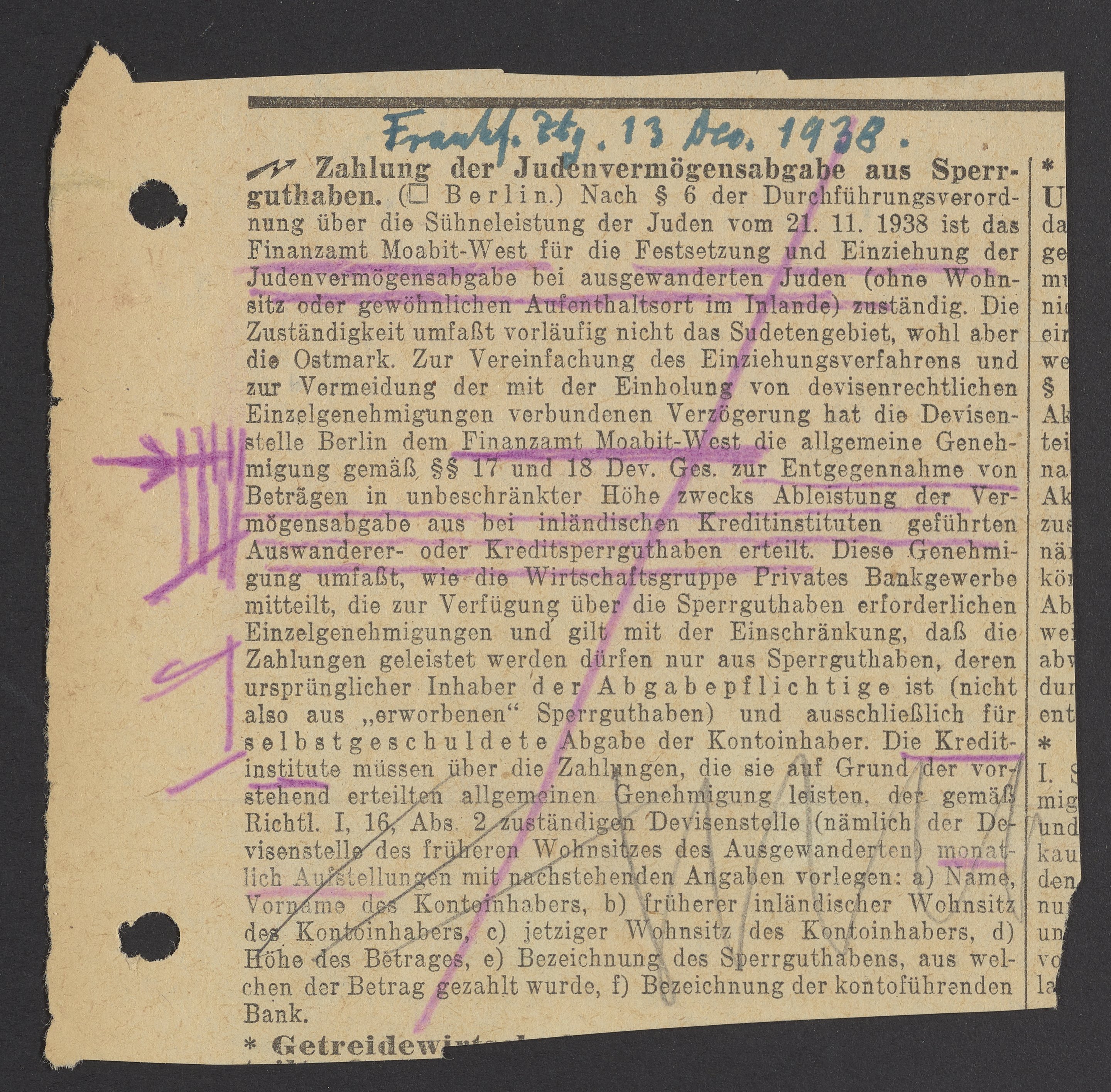 Zahlung der Jüdenvermögensabgabe aus Sperrguthaben