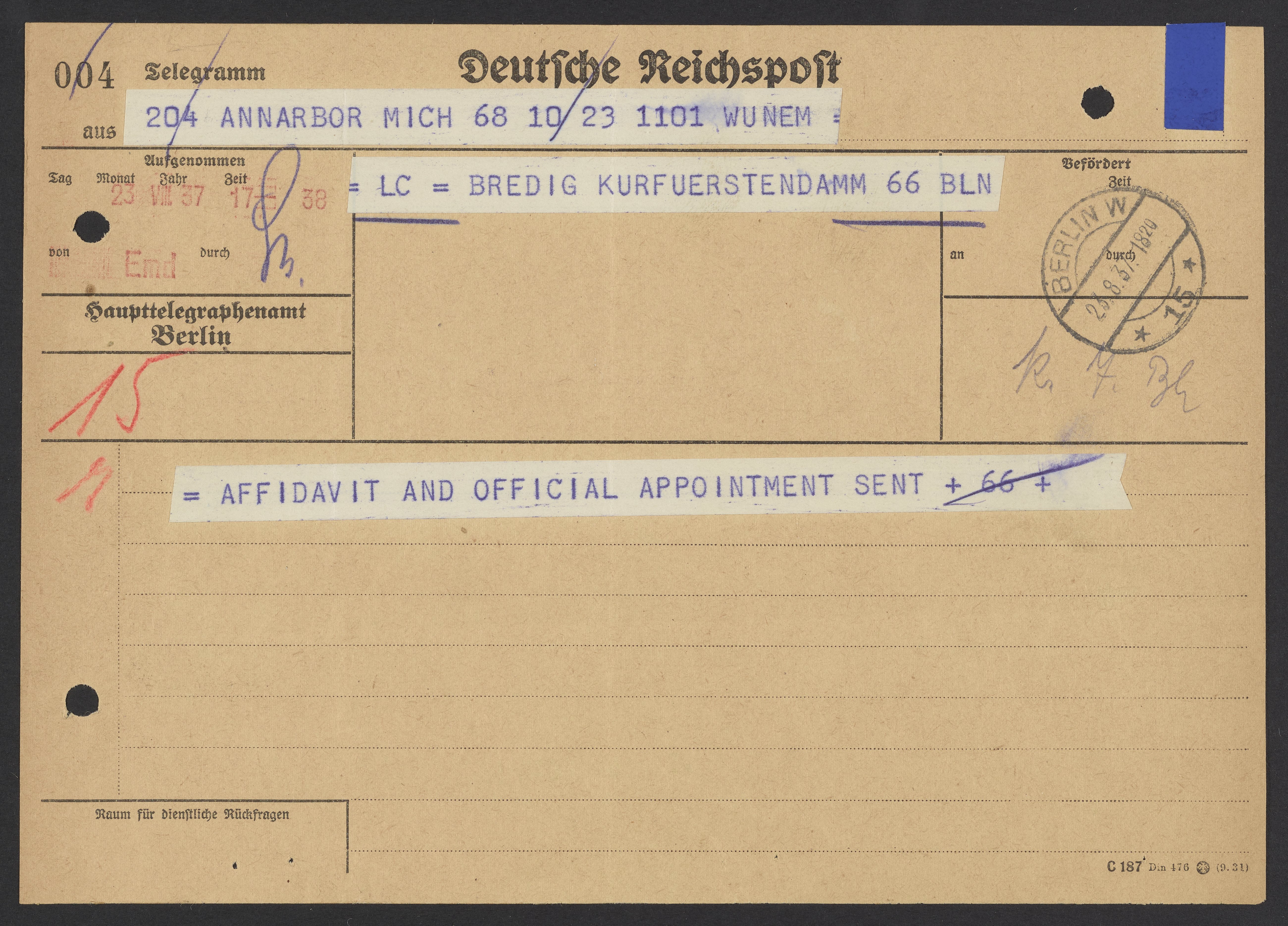 Kasmir Fajans (1887-1975) informs Max Bredig (1902-1977) by telegram that his affidavit for Bredig's American immigration visa and an appointment letter from the University of Michigan have been sent to him in Berlin, In 1937, after Bredig had experienced prejudice in his workplace and conditions began to worsen for Jewish citizens in Germany, Fajans helped Bredig secure a fellowship at the University of Michigan so that he could emigrate.
