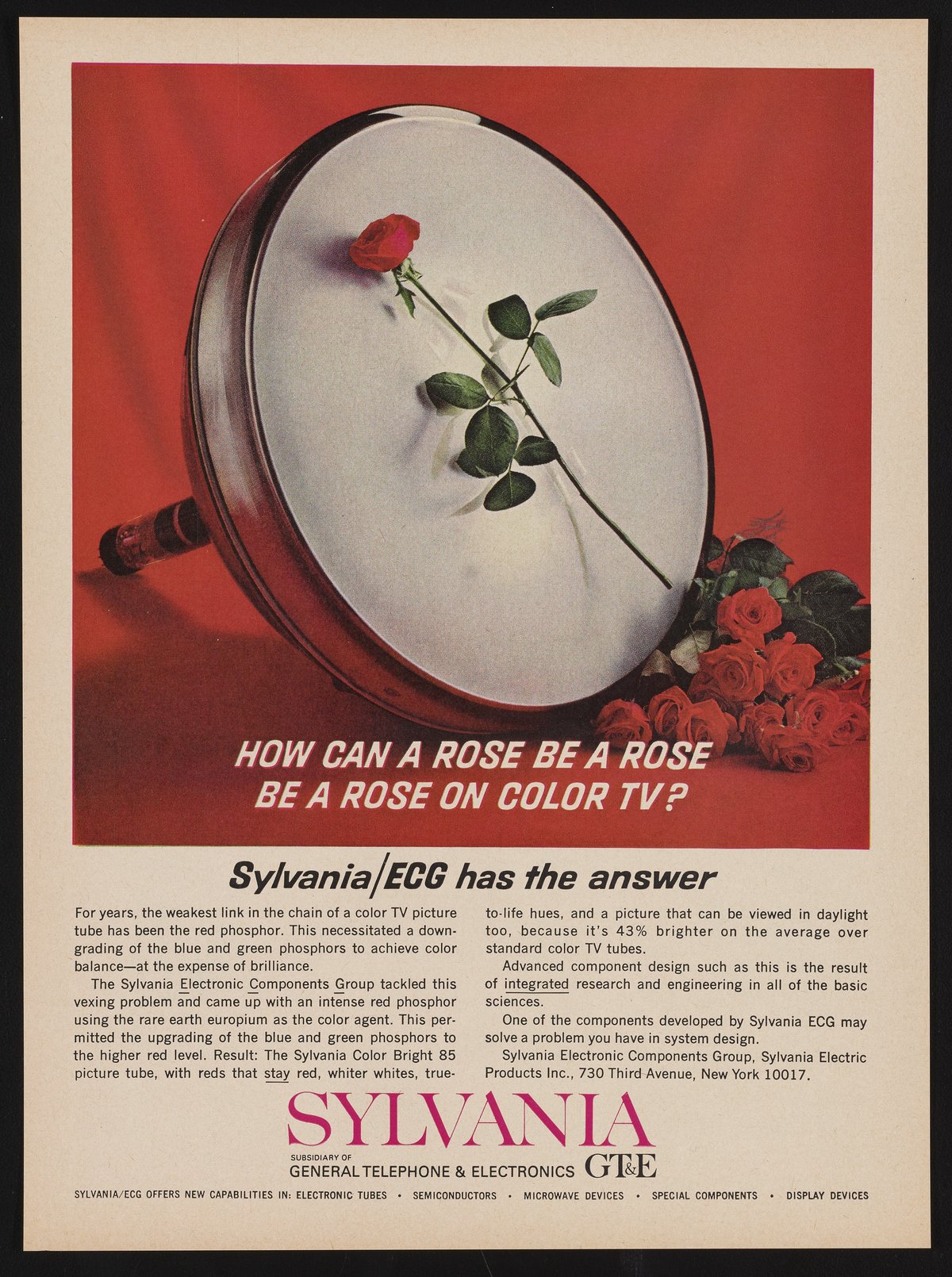 GTE Sylvania Incorporated. “How Can a Rose Be a Rose Be a Rose on Color TV?” Paper (fiber product), 1964. Science History Institute. Philadelphia. https://digital.sciencehistory.org/works/nyv9c8h.