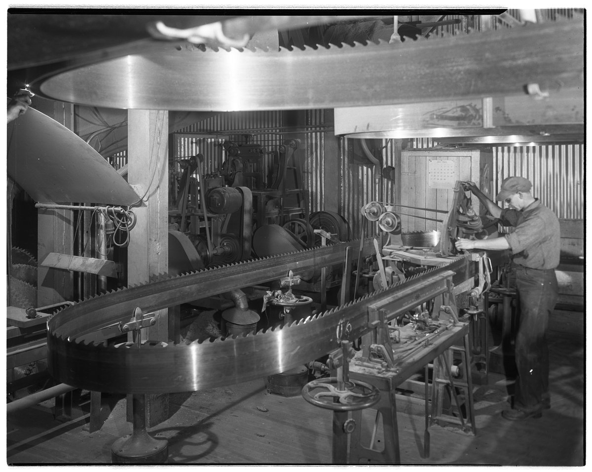 General view of an unidentified employee filing a band saw in the sawmill at the Cliffs Dow wood distillation plant located in Marquette, Michigan. Seeking a source of raw material for its new plastic, ethylcellulose, the Dow Chemical Company joined with the Cleveland-Cliffs Iron Company to form the Cliffs Dow Chemical Company in April 1935. The Cliffs Dow plant in Marquette primarily produced charcoal used in the manufacture of pig iron, as well as a range of chemical by-products including acetic acid, calcium acetate, wood alcohol, and ethyl alcohol. Notably, when the Marquette plant ceased operations in 1969, it was the last wood distillation plant in the United States.