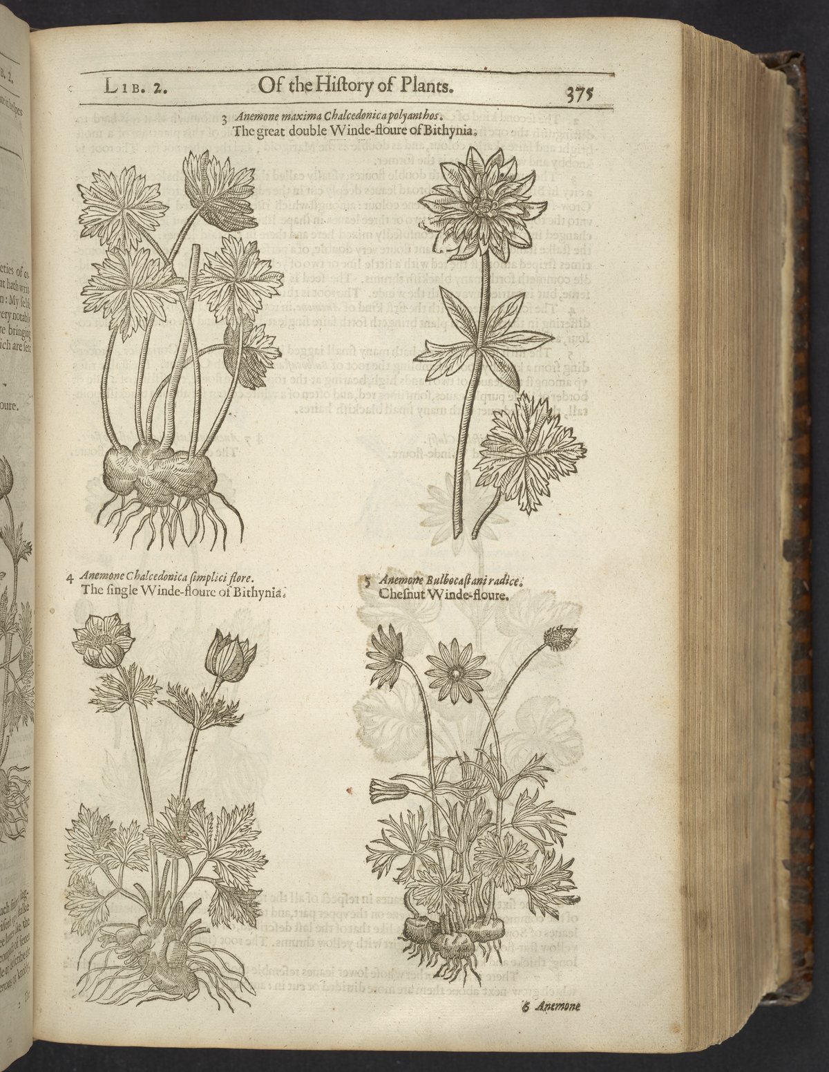 Gerard, John, Rembert Dodoens, and Iacobus Theodorus. “Various Floral Species of the Genus Anemone : Single, Double, and Chestnut Windflowers.” In The Herball, or, Generall Historie of Plantes. London, England: Thomas Johnson, 1633. https://digital.sciencehistory.org/works/o0kjpmd.