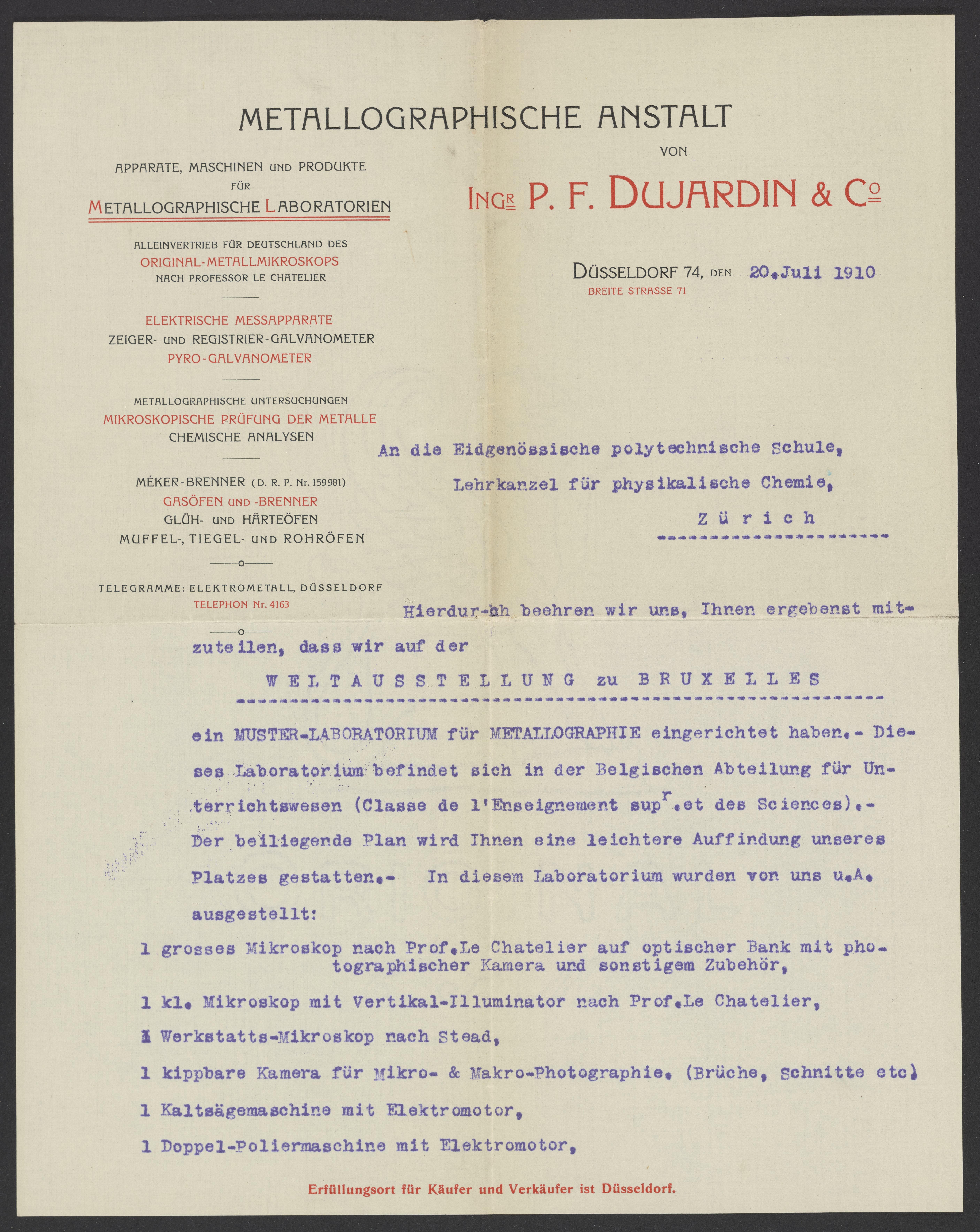 Letter from P.F. Dujardin & Co. advertising machines and products for metallographic laboratories