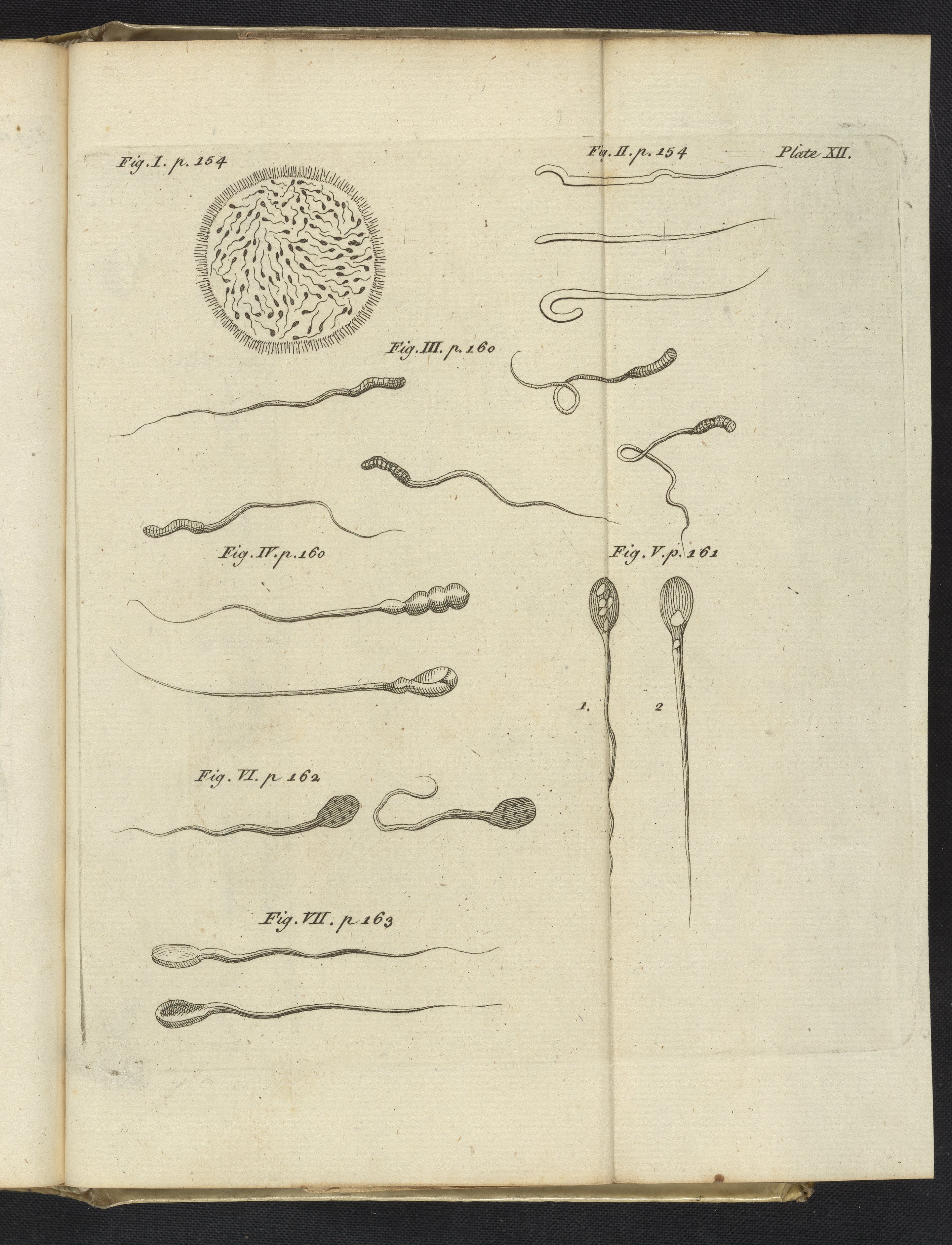 As described on accompanying pages listed next to the illustrations, this plate illustrates semen from various animals and a human (fig. VII) under magnification.