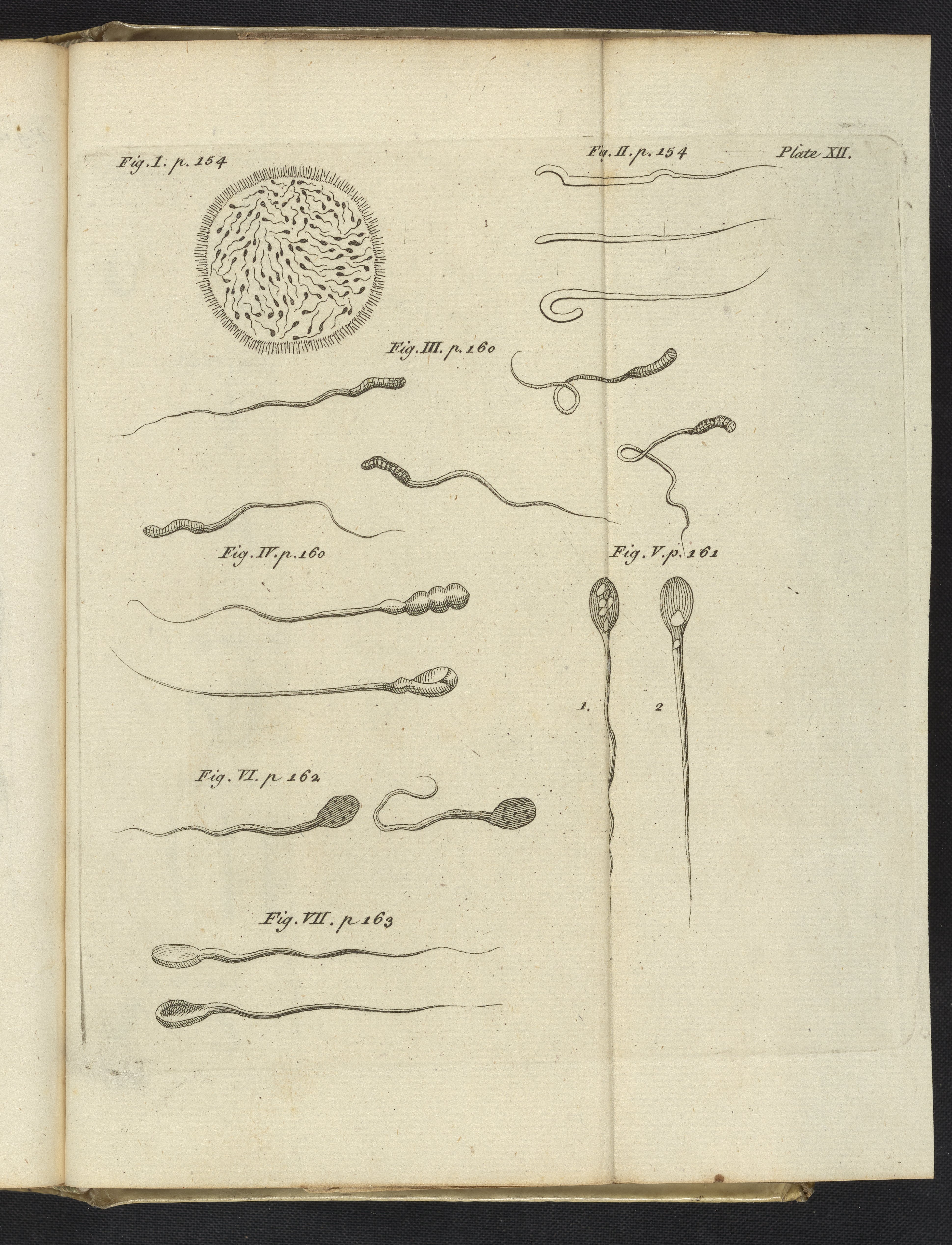 As described on accompanying pages listed next to the illustrations, this plate illustrates semen from various animals and a human (fig. VII) under magnification.