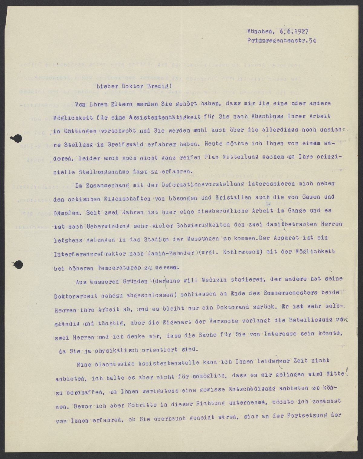 Ein planmässige Assistentenstelle kann ich Ihnen leider zur Zeit nicht anbiete, ich halte es aber für unmöglich, dass es mir gelingen wird Mittel zu beschaffen, um Ihnen wenigstens eine gewisse Entschädigung anbieten zu können. Bevor ich aber Schritte in dieser Richtung unternehme, möchte ich zunächst von Ihnen erfahren, ob Sie überhaupt geneigt wären, sich an der Fortsetzung der
