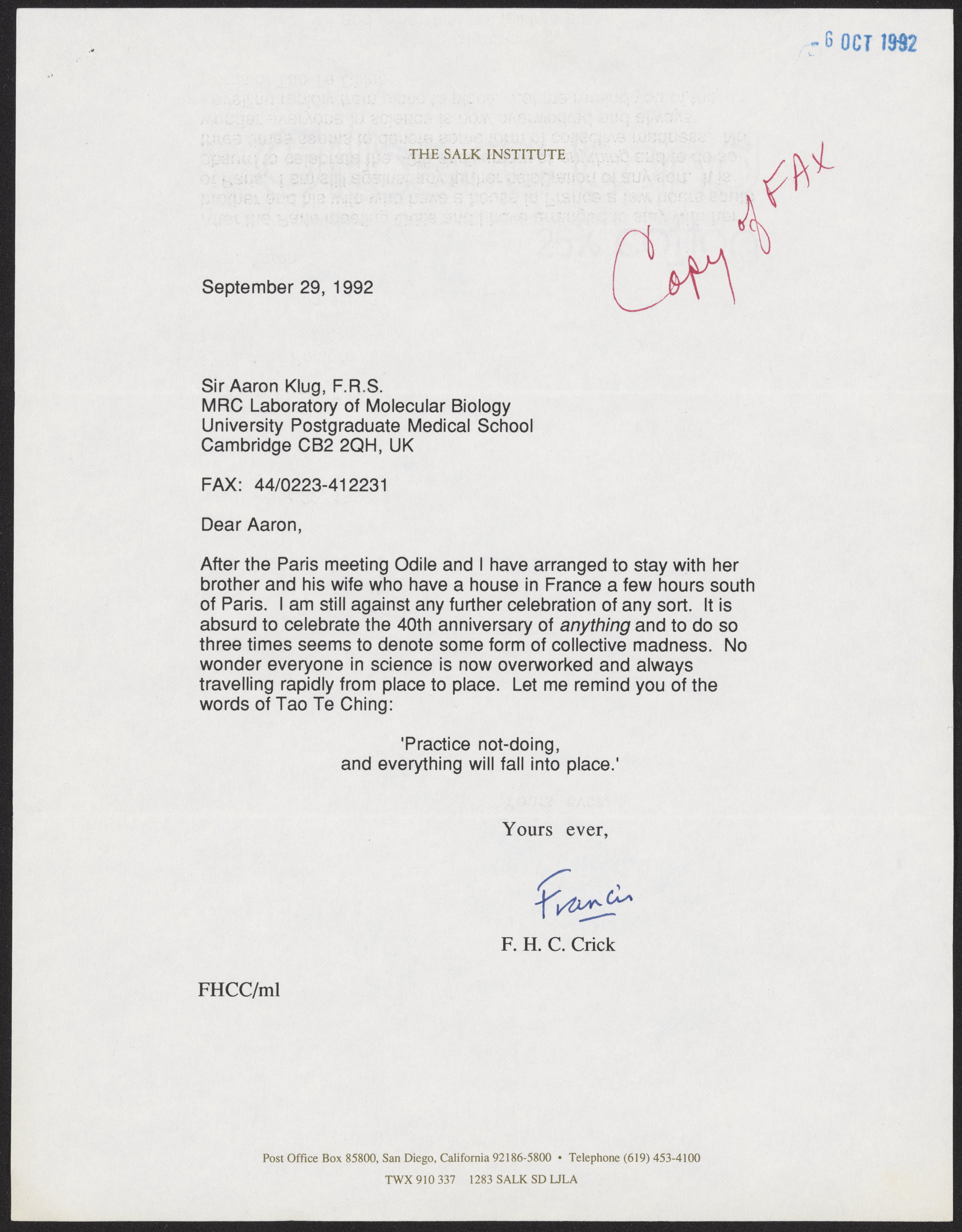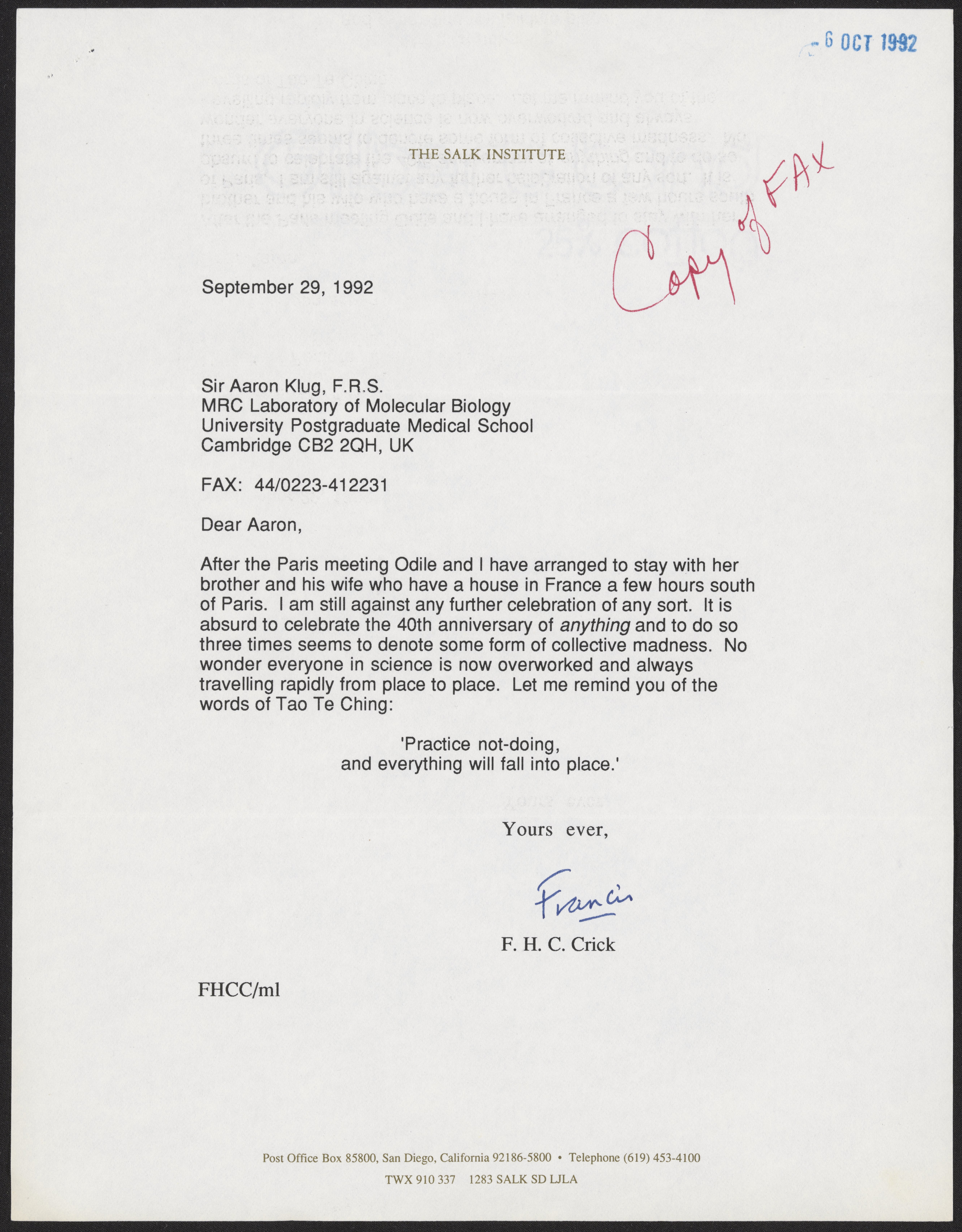 Crick, Francis. “Fax from Francis Crick to Aaron Klug, September 29, 1992,” September 29, 1992. History of Molecular Biology Collection, Box 20, Folder 5. Science History Institute. Philadelphia. https://digital.sciencehistory.org/works/o1wb3ww.