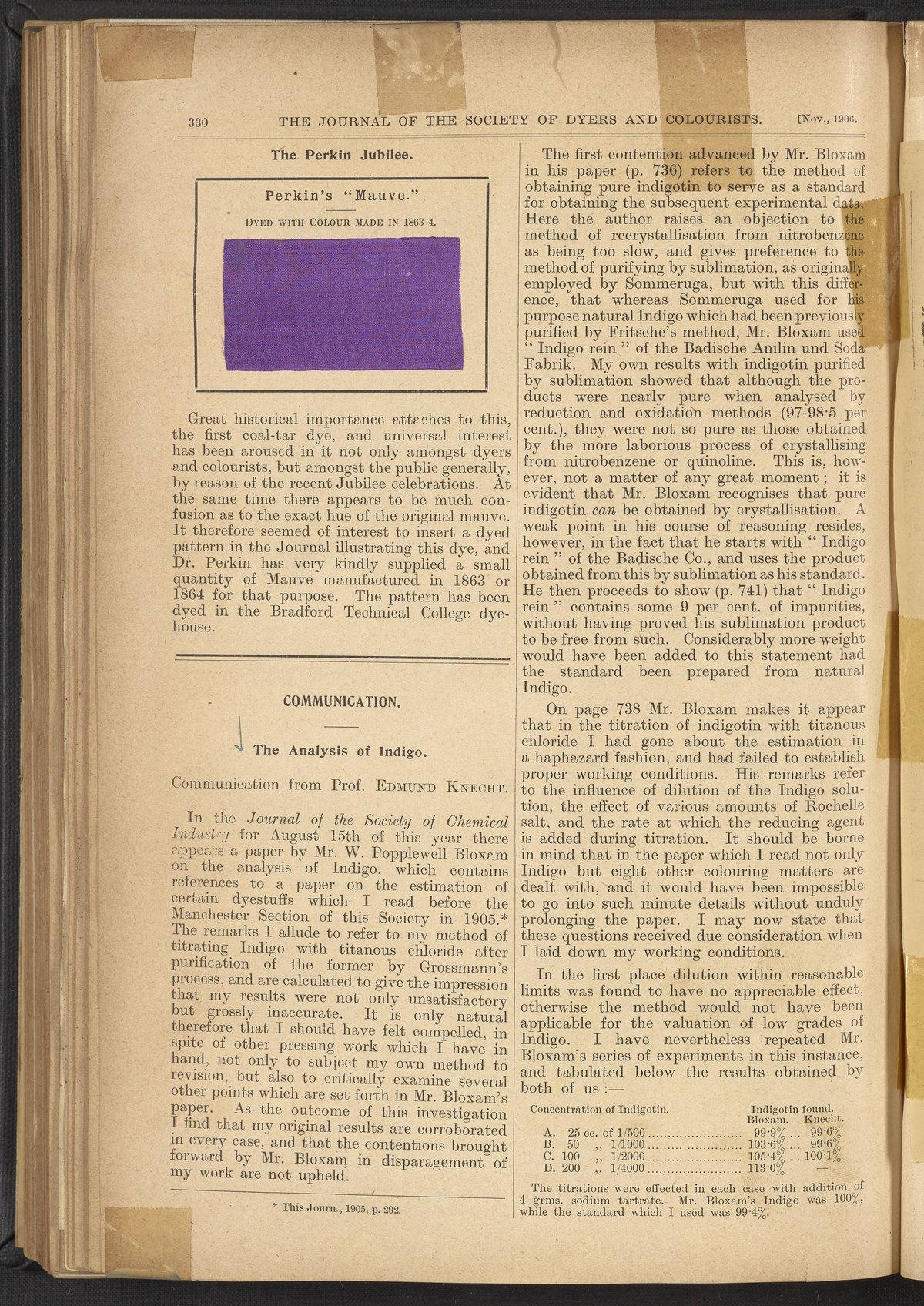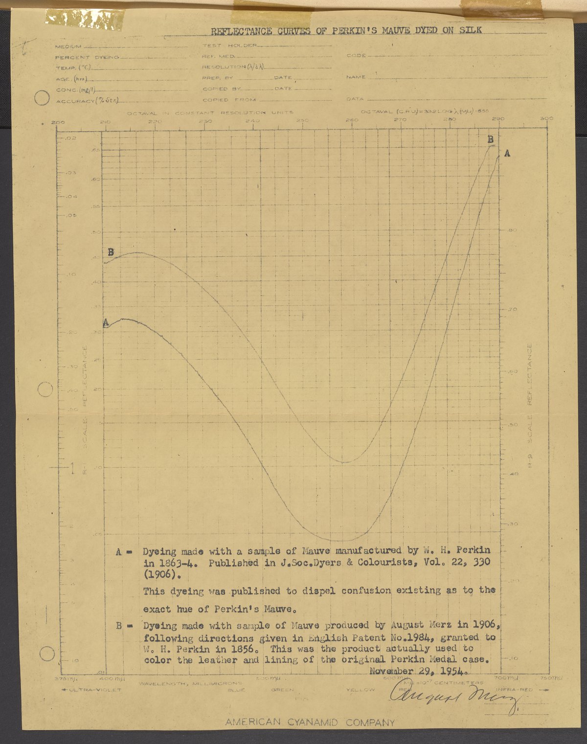 Digitized content includes a page from the November 1906 issue of the Journal of the Society of Dyers and Colourists and a foldout of an interleaved reflectance spectroscopy chart. The journal article excerpt includes an inset fabric sample dyed with "Perkin's Mauve," named for chemist William Henry Perkin (1838-1907). In 1856, when attempting to synthesize quinine, Perkin observed a bright purple residue. This residue turned out to be the first commercial aniline dye, marketed as Perkin's Mauve beginning in 1859. The sample pasted to this page was dyed by a small quantity of mauve supplied by Dr. Perkin himself and was intended to dispel confusion regarding the exact hue of Perkin's Mauve. The reflectance curve, dated 1954, compares the reflectance of a sample dyed with Mauve produced by Perkin in 1863 to a sample dyed with Mauve produced by August Merz in 1906.
