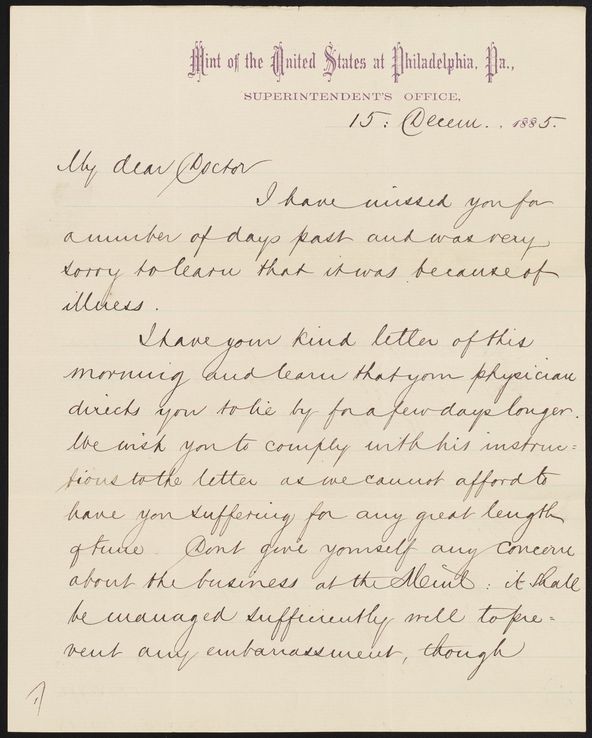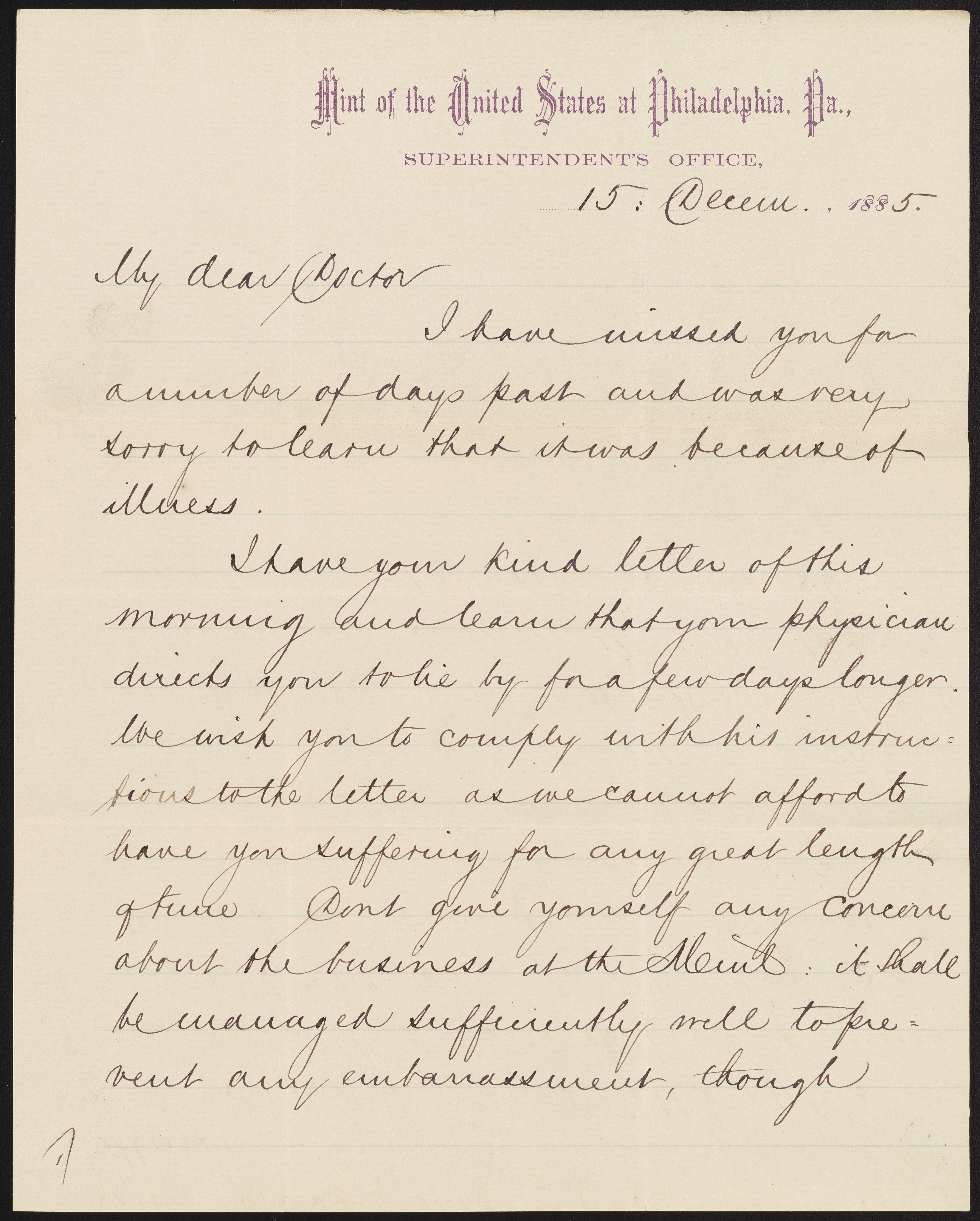 Small JPG1200 x 1495px — 231 KBLarge JPG2880 x 3586px — 1.2 MBFull-sized JPG5248 x 6535px — 4.0 MBOriginal fileTIFF — 5248 x 6535px — 98.2 MBDaniel M. Fox (1819-1890), Superintendent of the Mint of the United States at Philadelphia, commiserates with James Curtis Booth (1810-1888) in his illness and wishes him a speedy recovery.
