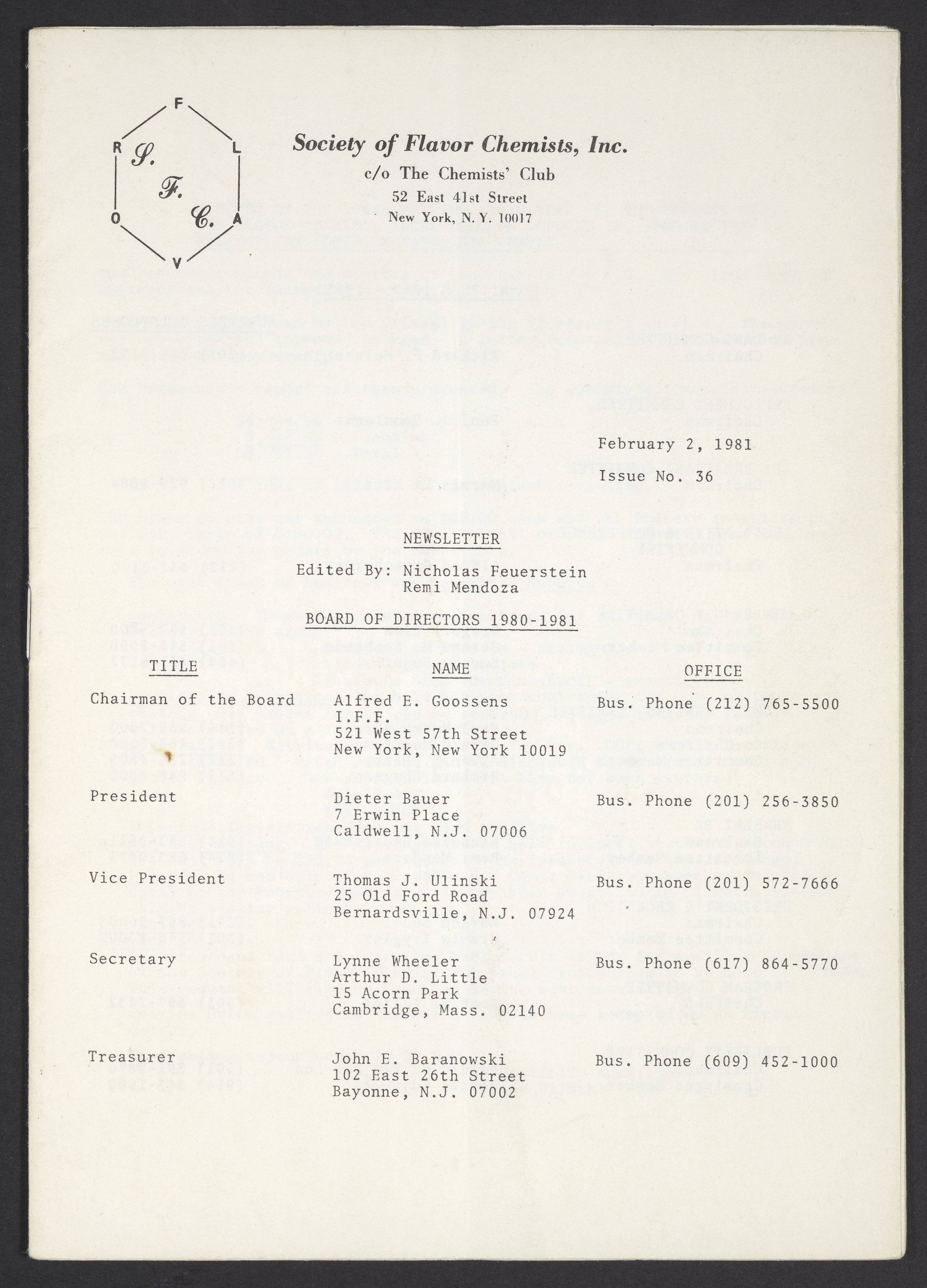 Society of Flavor Chemists. “Society of Flavor Chemists Newsletter, February 1981,” February 2, 1981. Society of Flavor Chemists Newsletters and Certificate of Incorporation, Box 1, Folder 1. Science History Institute. Philadelphia. https://digital.sciencehistory.org/works/o4z8ync.