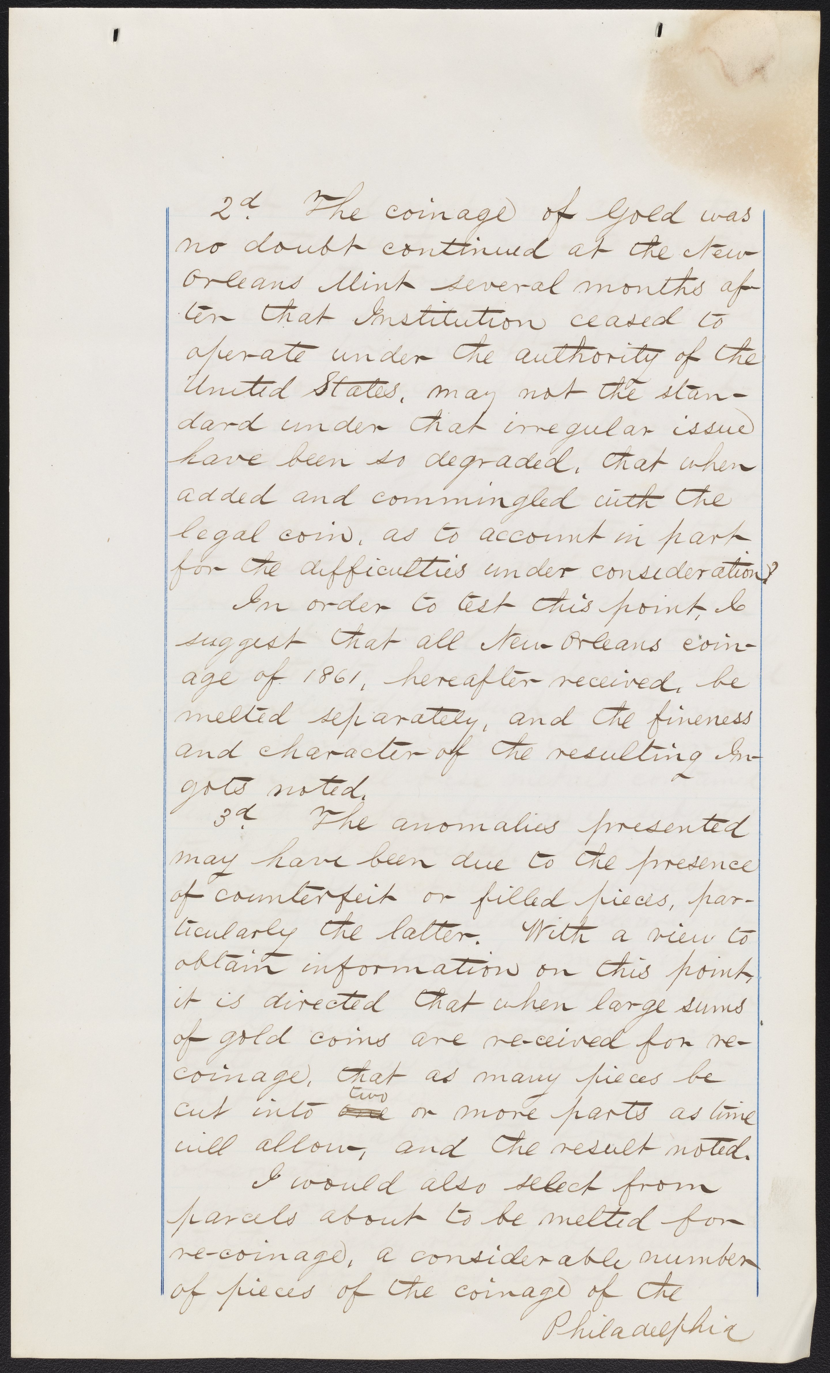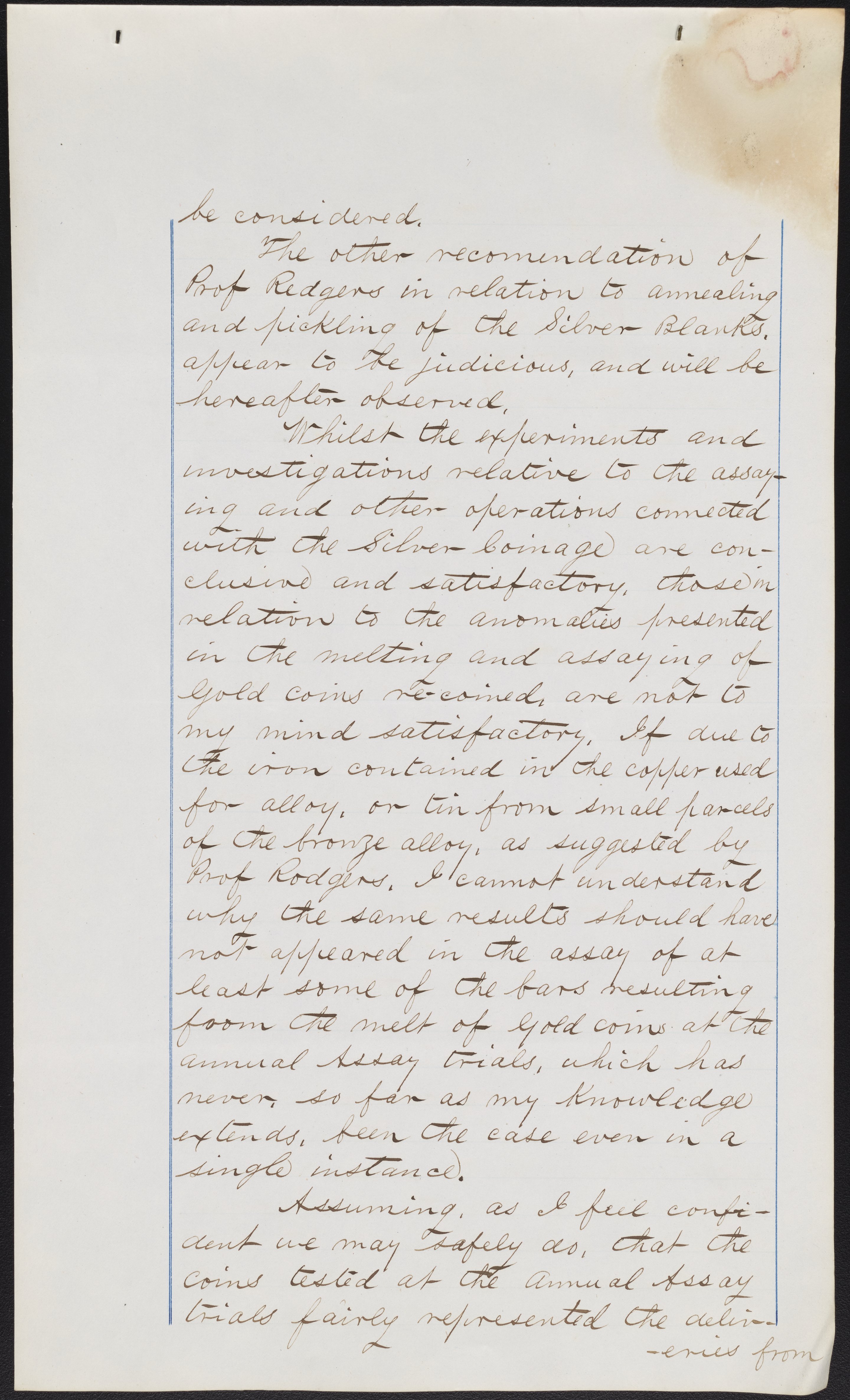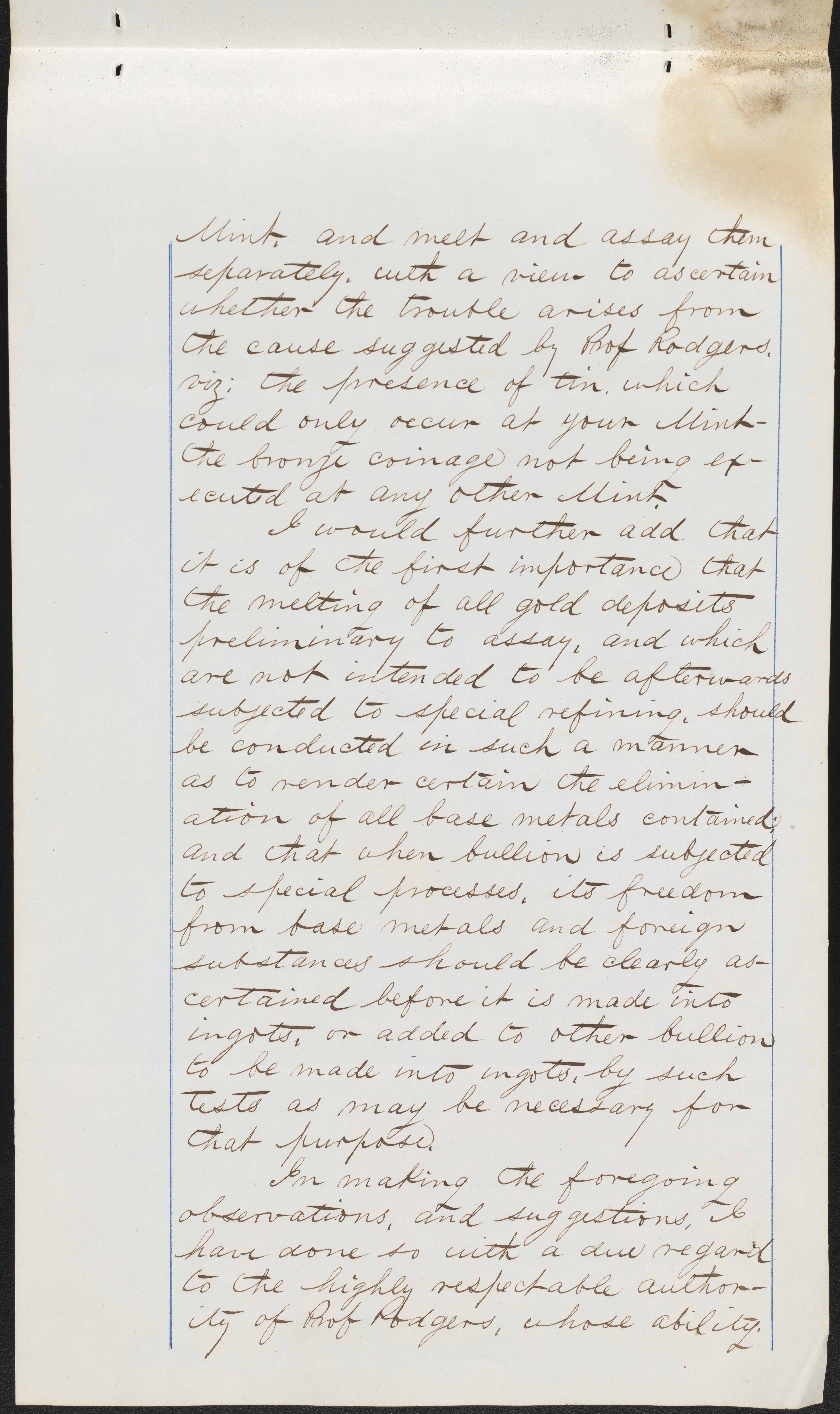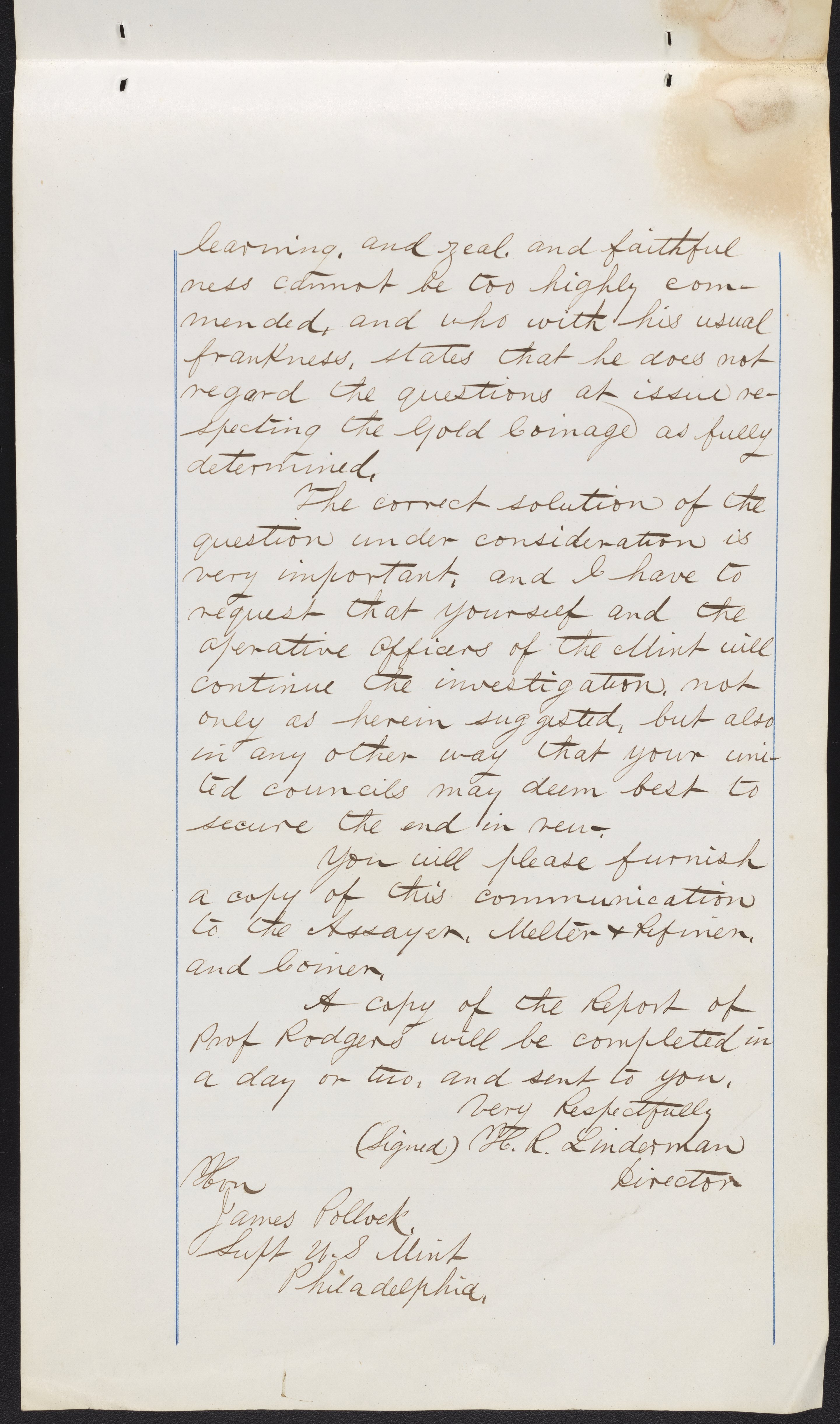 Small JPG1200 x 1991px — 401 KBLarge JPG2880 x 4779px — 1.8 MBFull-sized JPG5412 x 8980px — 5.5 MBOriginal fileTIFF — 5412 x 8980px — 139 MBJames Curtis Booth's (1810-1888) copy of a letter from H.R. Linderman (1825-1879), who was appointed as superintendent of the United States Mint in April 1873, to James Pollock, the former director of the Mint. Linderman notes recommendations by one Prof. Rodgers concerning assaying and reporting of silver ingots for coinage.