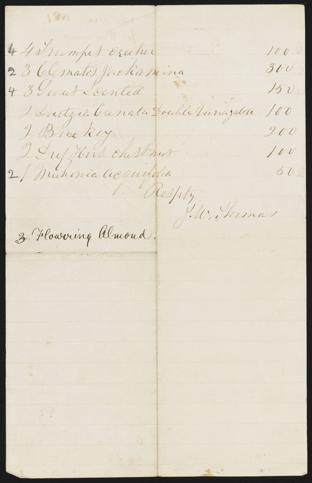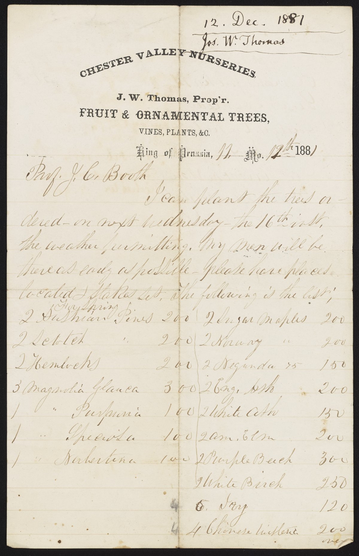 Letter from J.W. Thomas to James Curtis Booth, December 12, 1881