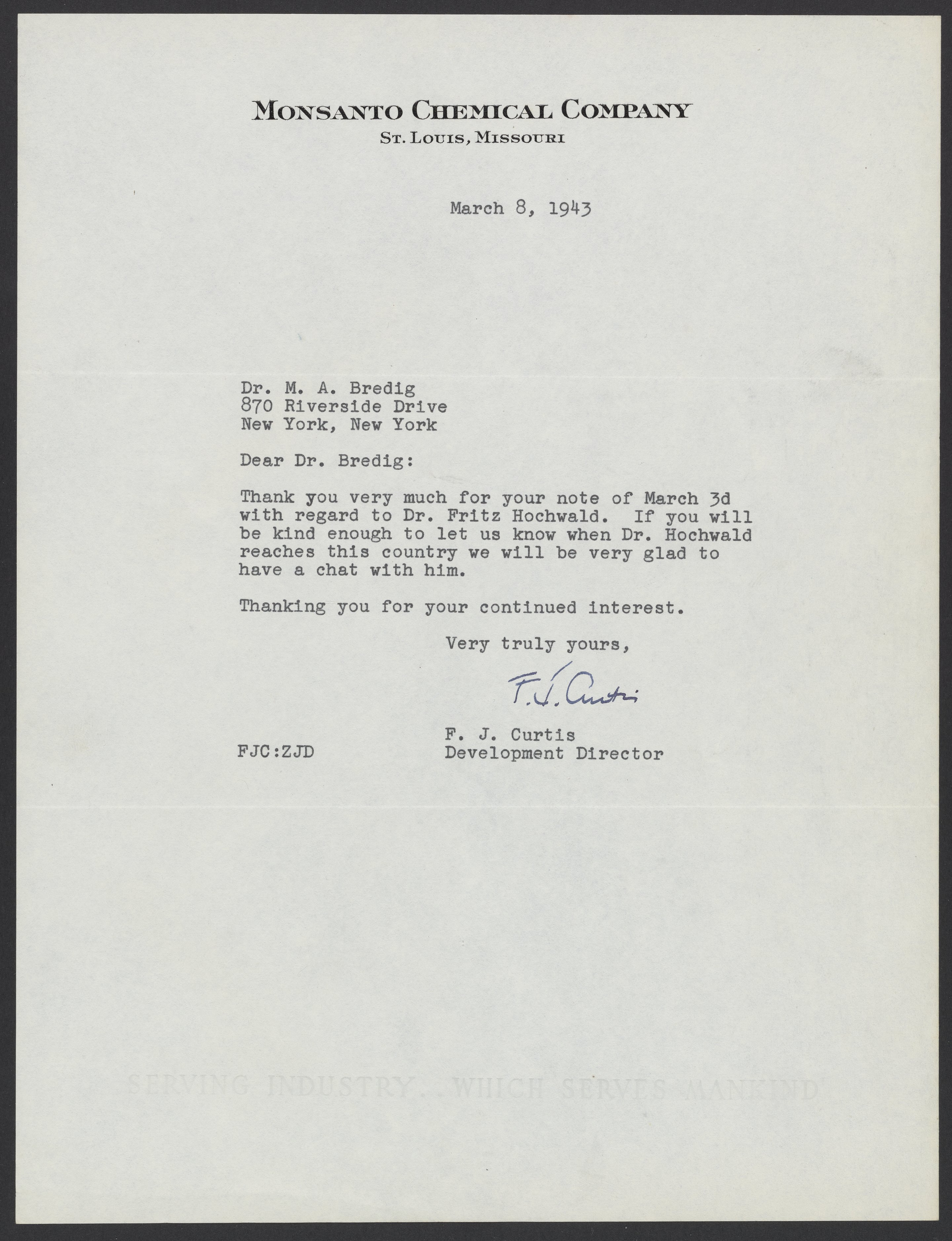 Francis J. Curtis, of the Monsanto Chemical Company, asks Max Bredig (1902-1977) to inform him when Fritz Hochwald (1897-1968) arrives to the United States.