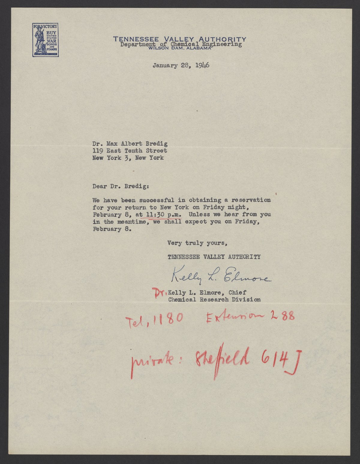 Letter from Kelly L. Elmore to Max Bredig, January 28, 1946