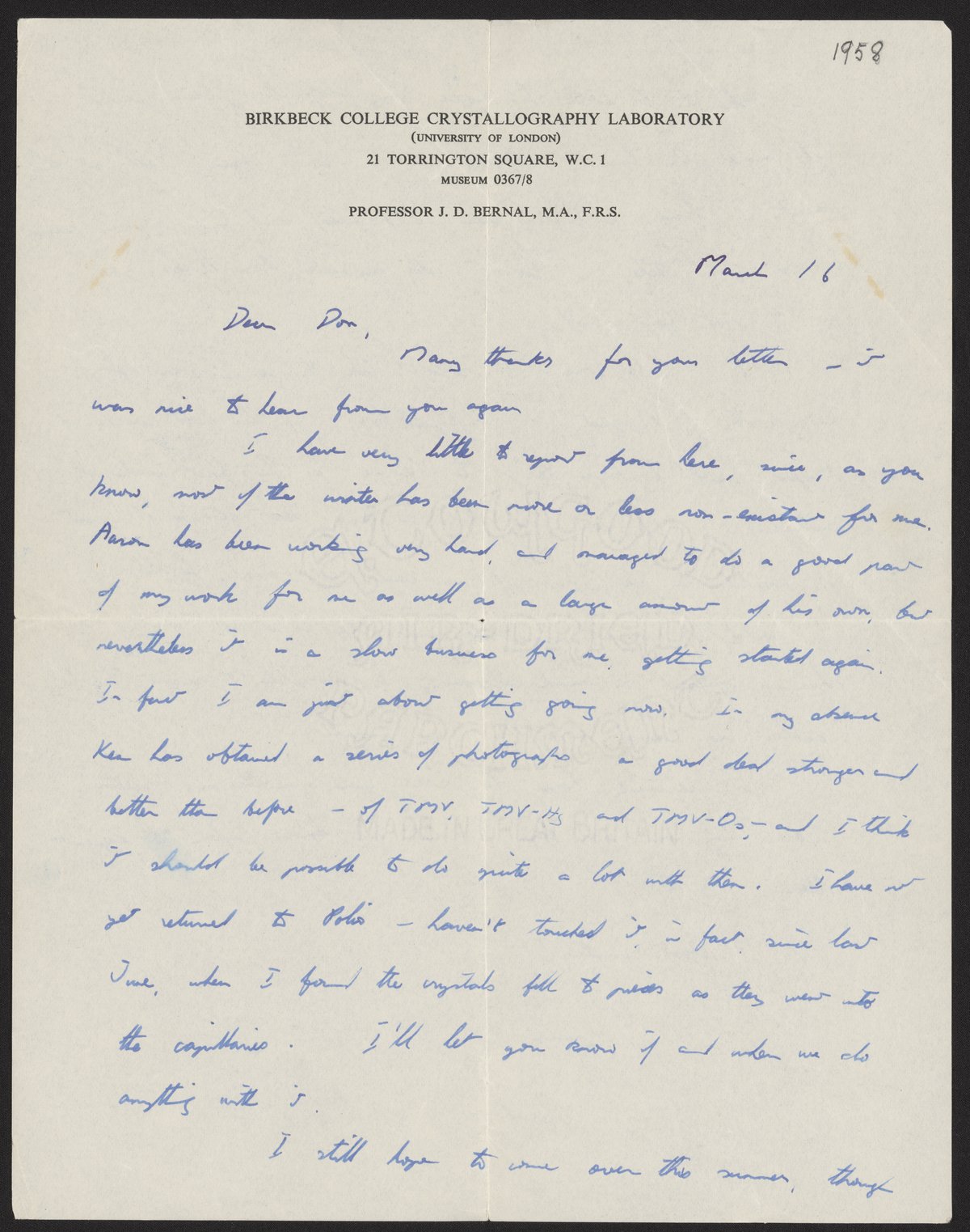 Letter from Rosalind Franklin to Donald Caspar, March 16, 1958