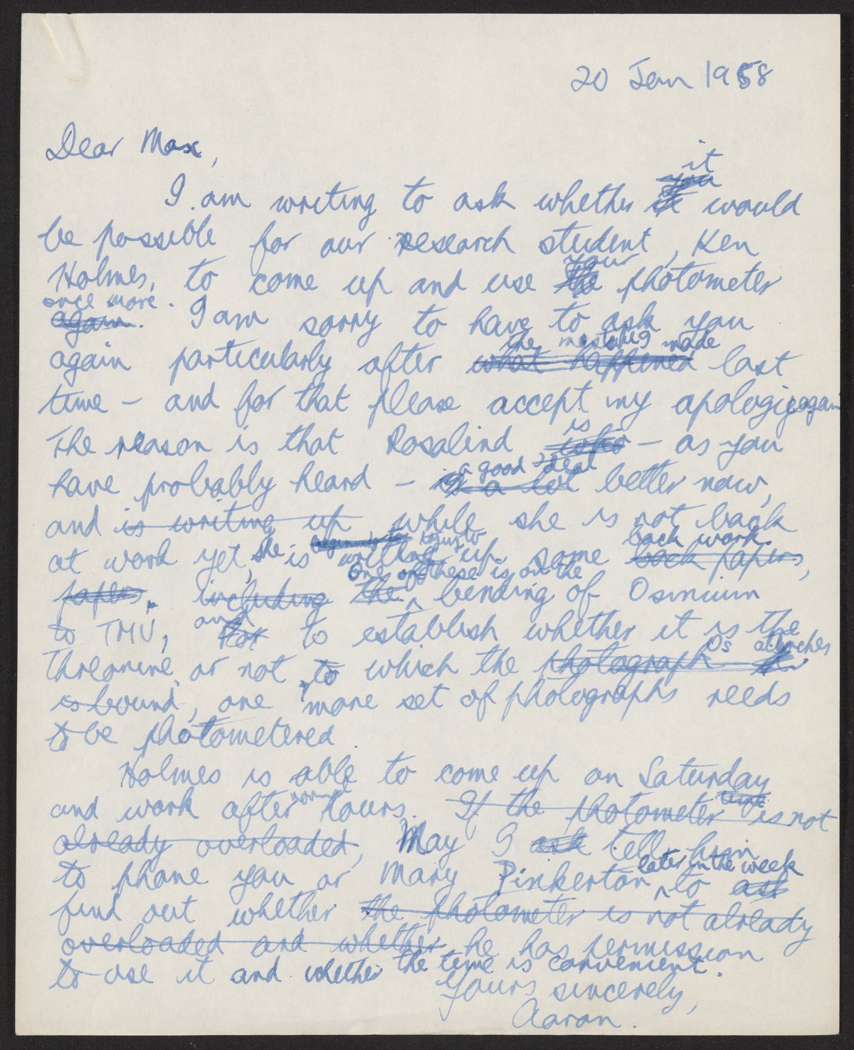 Letter from Aaron Klug to Max Perutz, January 20, 1958