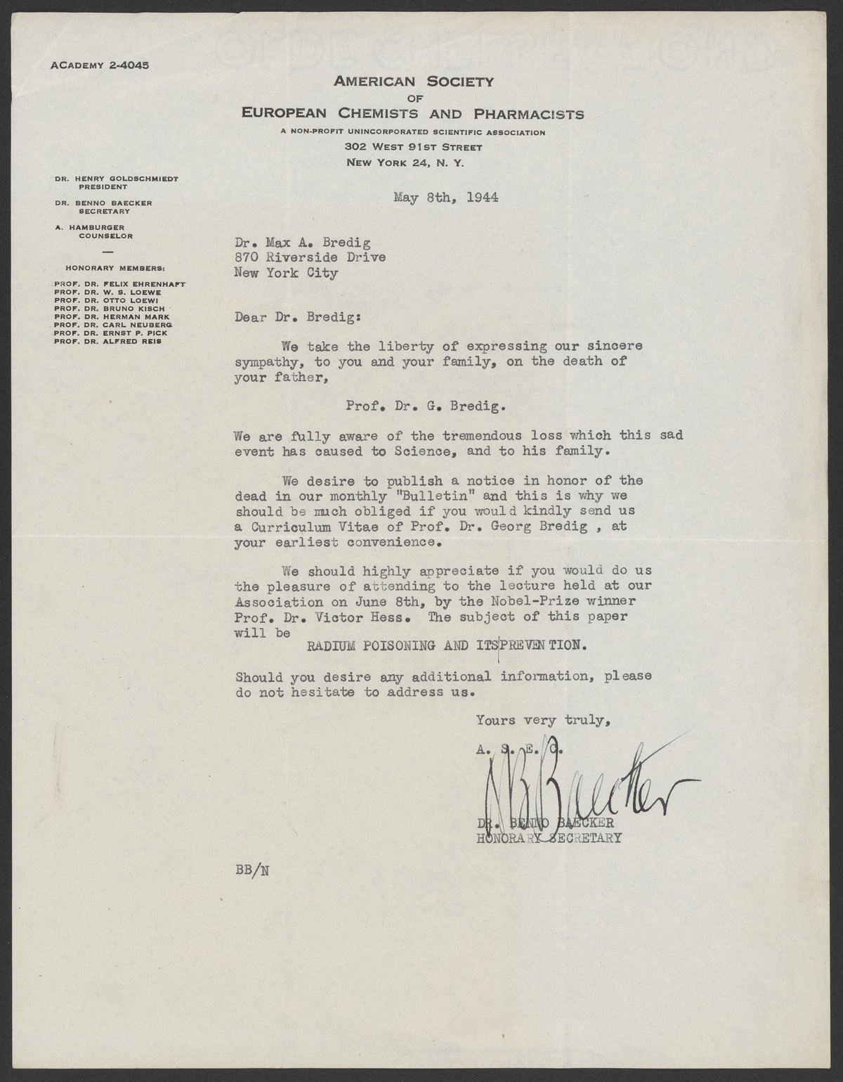 Backer, Benno. “Letter to Max Bredig from the American Society of European Chemists and Pharmacists,” May 8, 1944. Papers of Georg and Max Bredig, Box 7, Folder 2. Science History Institute. Philadelphia. https://digital.sciencehistory.org/works/ocohixe.