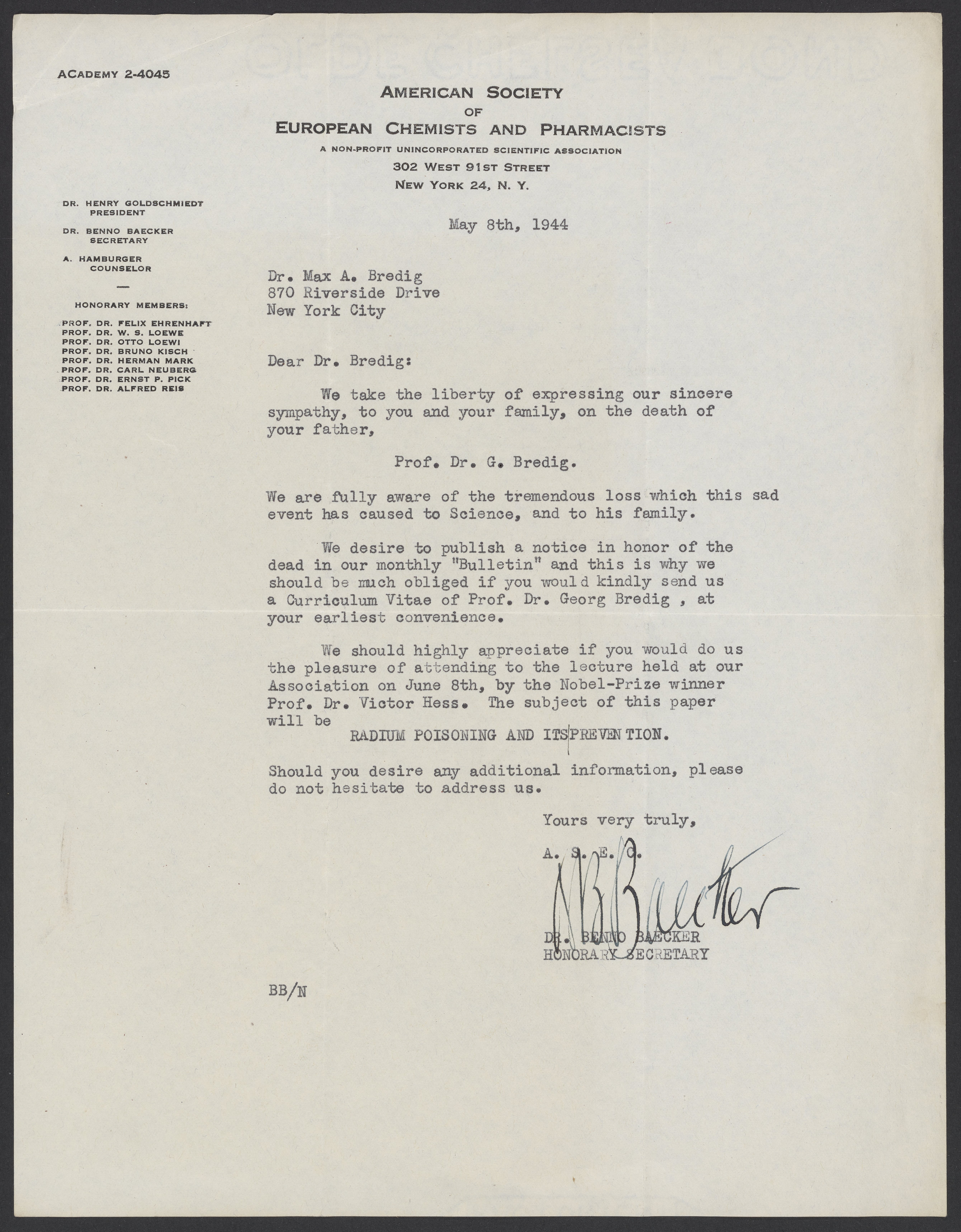Backer, Benno. “Letter to Max Bredig from the American Society of European Chemists and Pharmacists,” May 8, 1944. Papers of Georg and Max Bredig, Box 7, Folder 2. Science History Institute. Philadelphia. https://digital.sciencehistory.org/works/ocohixe.
