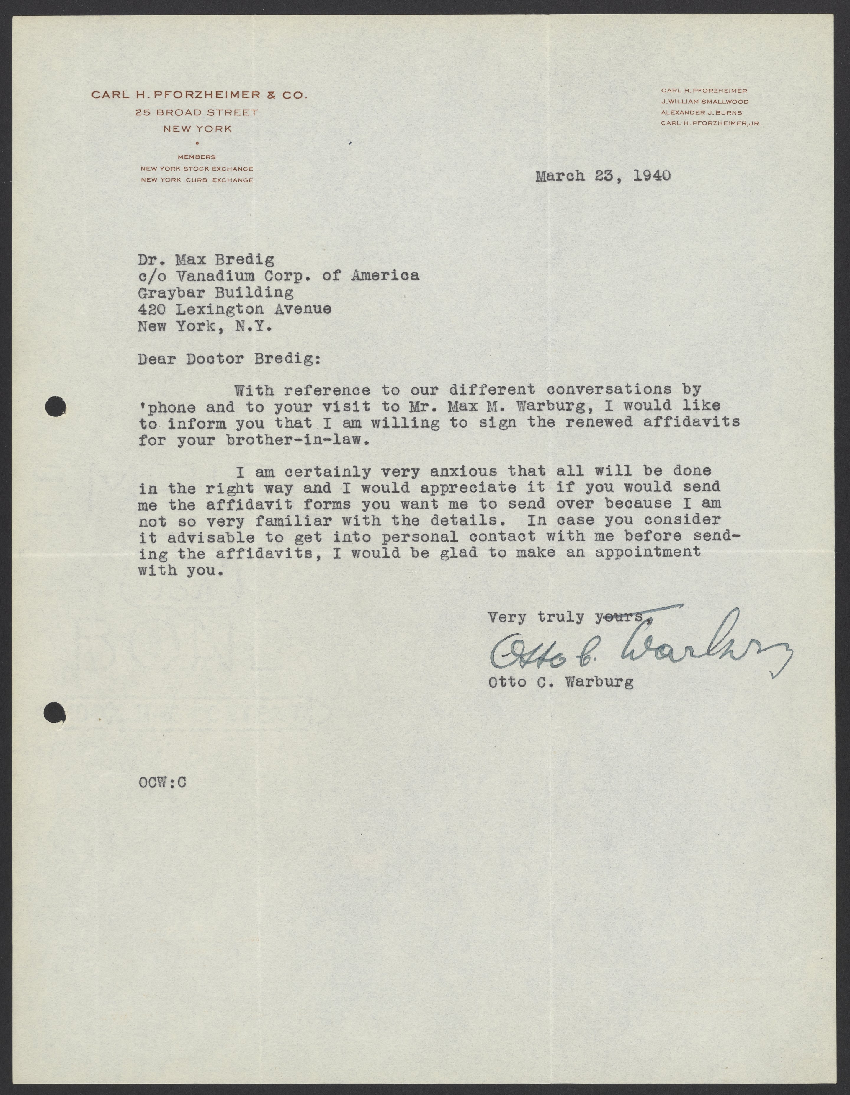 Letter from Otto C. Warburg to Max Bredig, March 23, 1940