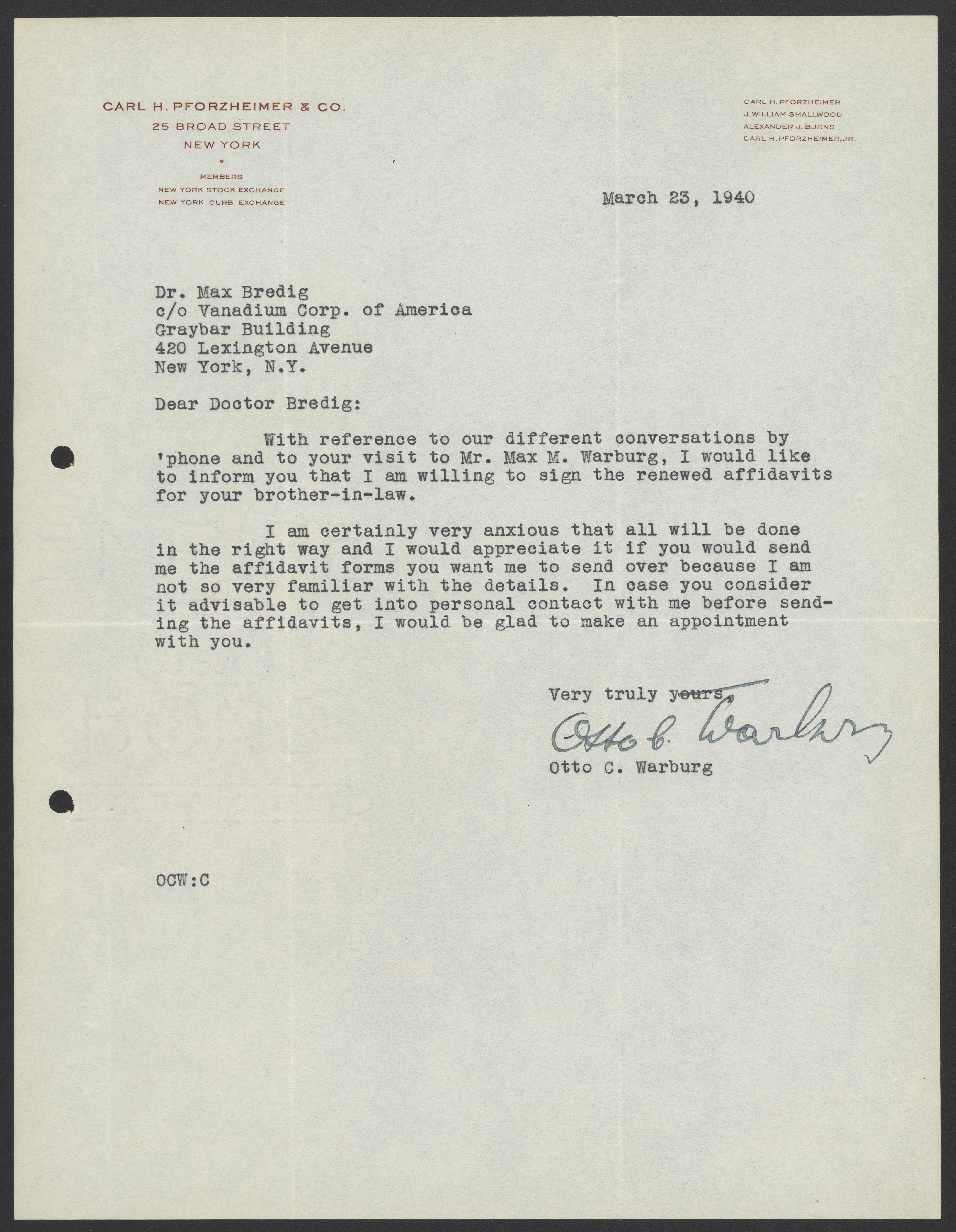 Letter from Otto C. Warburg to Max Bredig, March 23, 1940