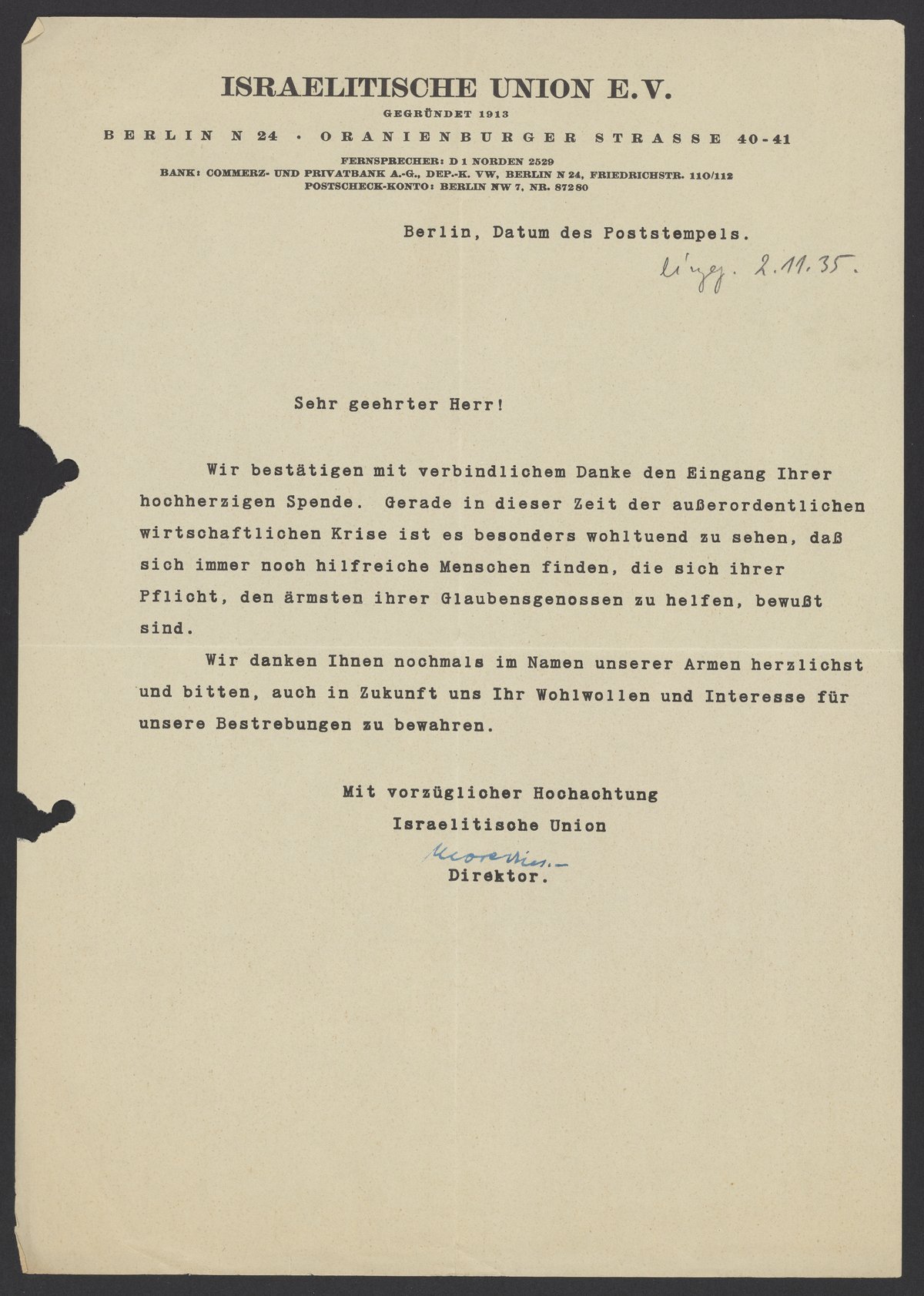 Letter from Israelitische Union E.V. to Max Bredig