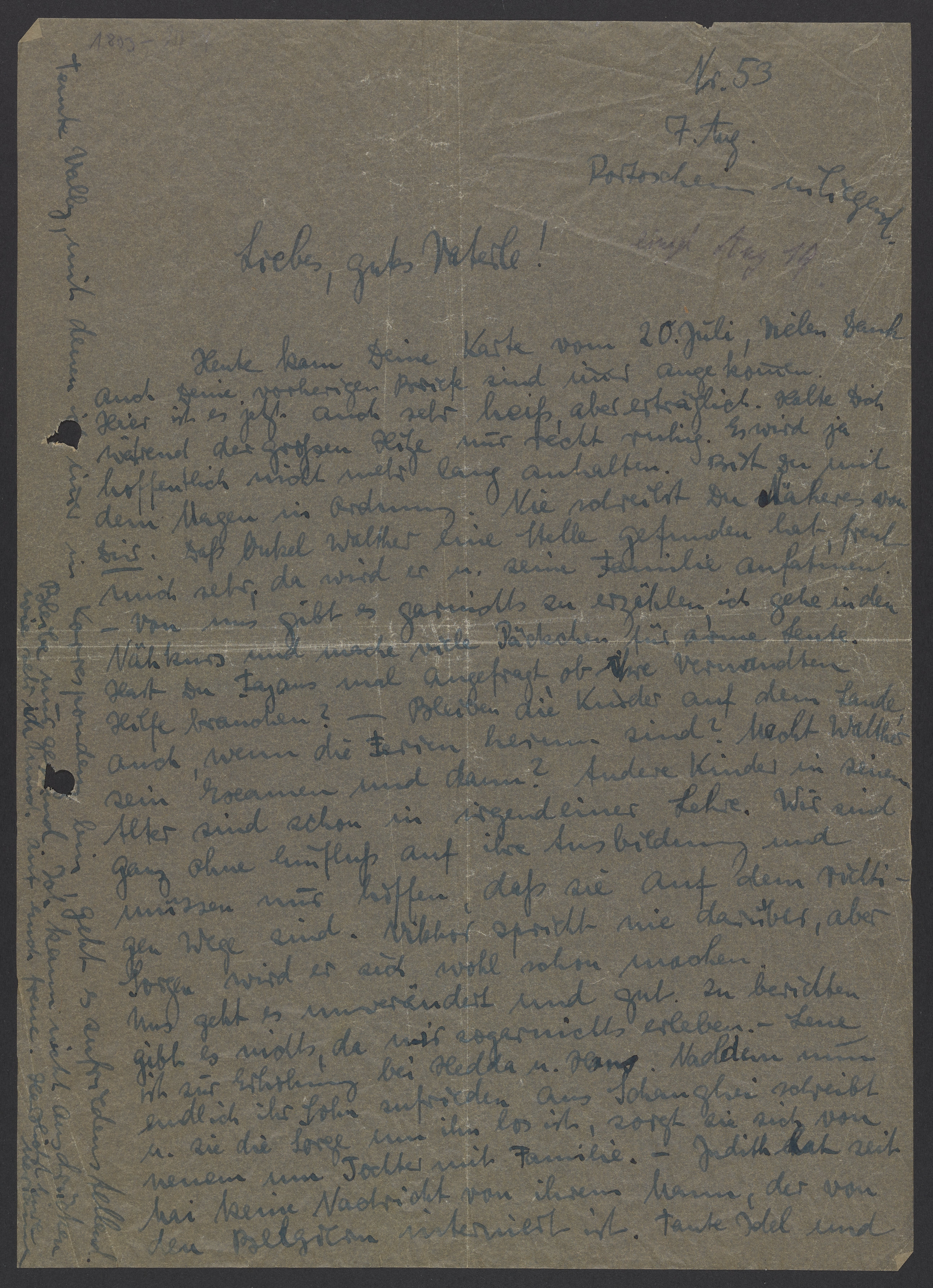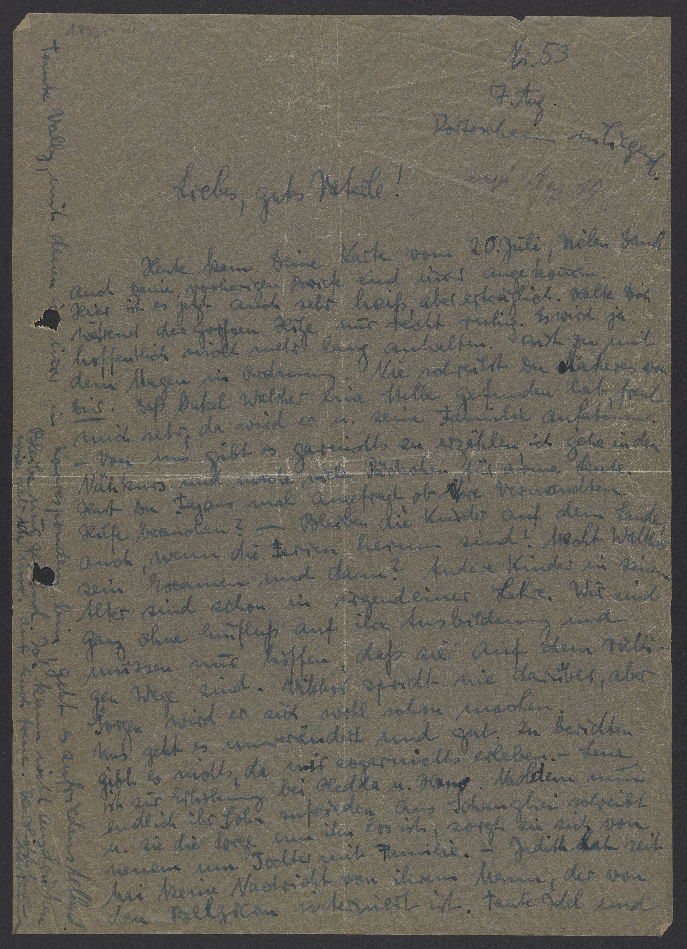 Heute kam Deine Karte vom 20. Juli, vielen Dank! Auch Deine vorherigen Briefe sind immer angekommen. Hier ist es jetzt auch sehr heiß, aber erträglich. Halte Dich während der großen Hitze nur recht ruhig. Es wird ja hoffentlich nicht mehr lang anhalten. Bist Du mit dem Magen in Ordnung. Nie schreibst Du Näheres von Dir. Dass Onkel Walther eine Stelle gefunden hat, freut mich sehr, da wird er u. seine Familie anfahren. Von uns gibt es garnichts zu erzählen, ich gehe in den Nähkurs und mache viele Päckchen für arme Leute. Hast Du Fajans mal angefragt, ob ihre Verwandten Hilfe brauchen? – Bleiben die Kinder auf dem Lande, auch wenn die Ferien herum sind? Macht Walther sein Examen und dann? Andere Kinder in seinem Alter sind schon in einer Lehre. Wir sind ganz ohne Einfluss auf ihre Ausbildung und müssen nur hoffen, daß sie auf dem richtigen Wege sind. Viktor spricht nie darüber, aber Sorgen wird er sich wohl machen.