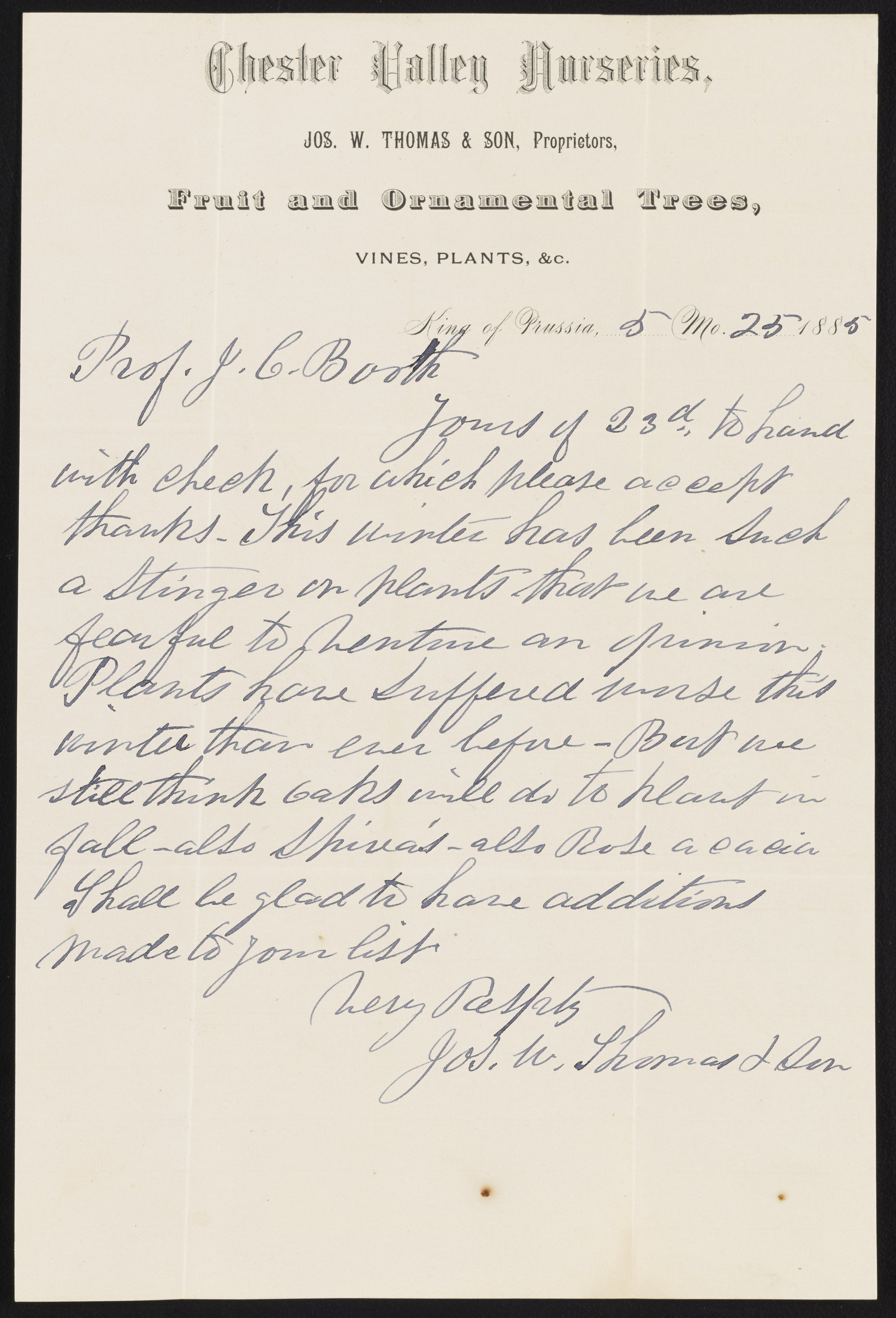 Thomas, Joseph W. “Letter from J.W. Thomas to James Curtis Booth, May 25, 1885,” May 25, 1885. Papers of James Curtis Booth, Box 2, Folder 10. Science History Institute. Philadelphia. https://digital.sciencehistory.org/works/ofjz751.