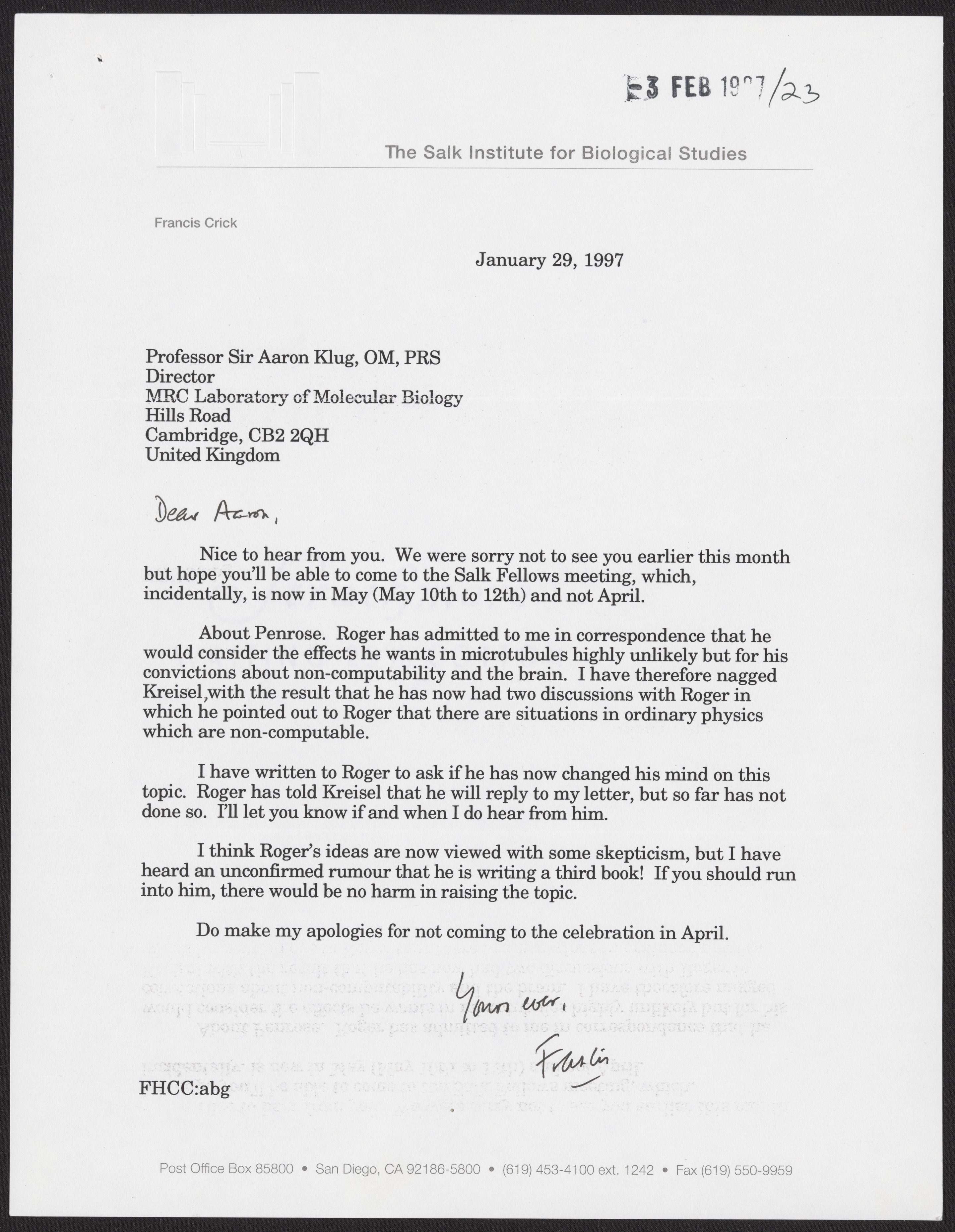 Crick, Francis. “Letter from Francis Crick to Aaron Klug, January 29, 1997,” January 29, 1997. History of Molecular Biology Collection, Box 20, Folder 6. Science History Institute. Philadelphia. https://digital.sciencehistory.org/works/oglag6w.