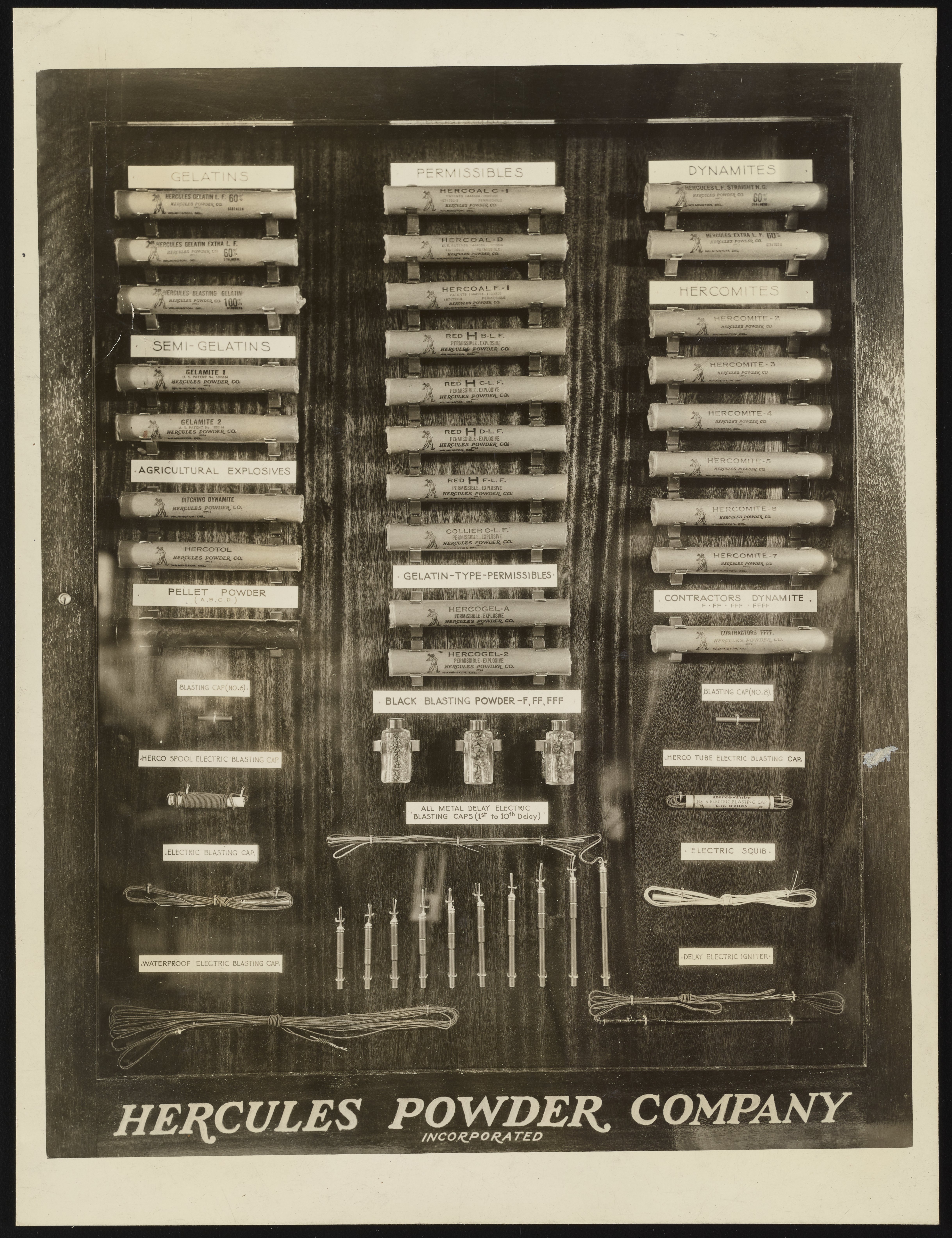 General view of an exhibit panel featuring samples of various explosives manufactured and sold by the Hercules Powder Company.