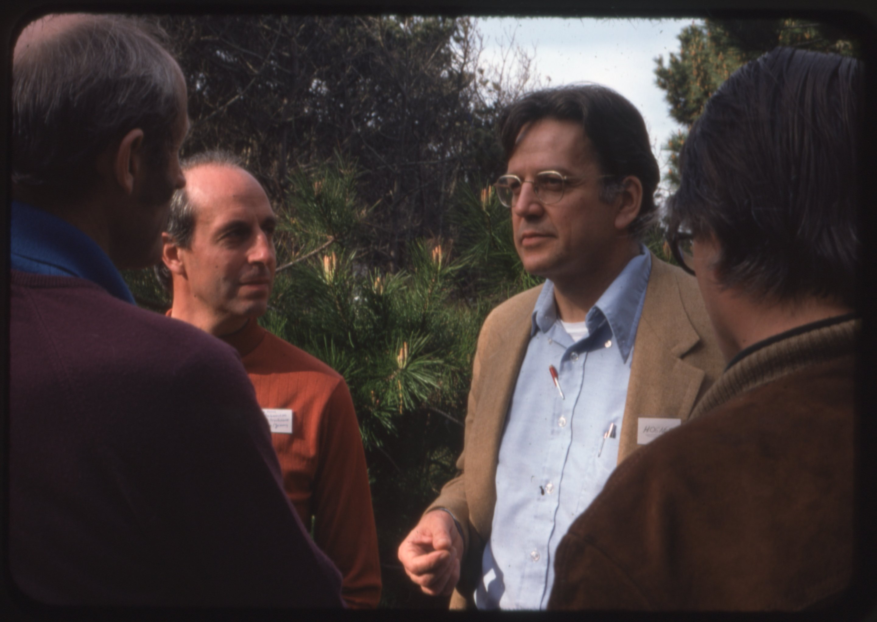 "Color transparency of David S. Hogness (1925-2019) and Peter H. Hofschneider (1929-2004) at the 1975 Asilomar Conference.