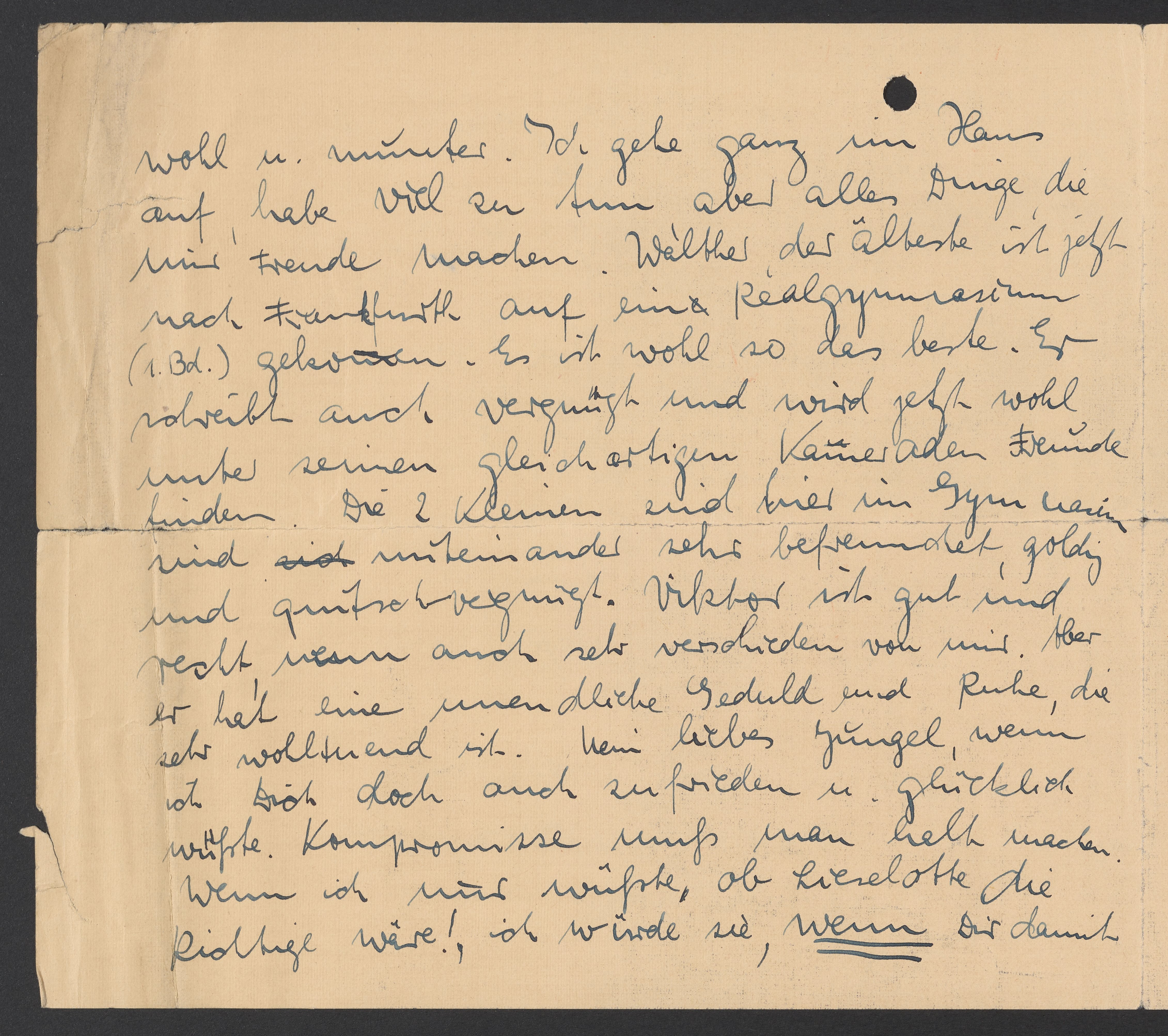 wohl und munter. Ich gehe ganz im Haus auf, habe viel zu tun aber alle Dinge, die mir Freude machen. Walther, der älteste ist jetzt nach Frankfurt auf ein Realgymnasium (1.Bd.) gekommen. Es ist wohl so das Beste. Er schreibt auch vergnügt und wird jetzt wohl unter seinem gleichartigen Kameraden Freunde finden. Die 2 Kleinen sind hier im Gymnasium, sind miteinander sehr befreundet, goldig und gründlich vergnügt. Viktor ist gut und recht, wenn auch sehr verschieden von mir. Aber er hat eine unendliche Geduld und Ruhe, die sehr wohltuend ist. Mein liebes Jungel, wenn ich Dich doch auch zufrieden u. glücklich wüßte. Kompromisse mußt man halt machen. Wenn ich mir wüßte, ob Lieselotte die Richtige wäre!, ich würde sie, wenn Dir damit