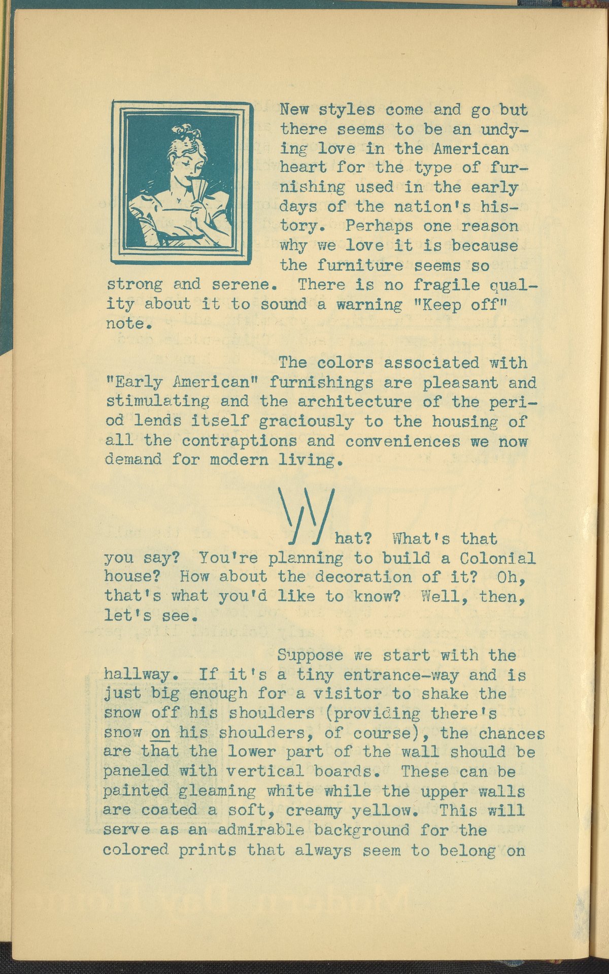Booklet corresponding to a radio broadcast program created by the National Paint, Varnish, and Lacquer Association. The booklet consists of two parts. Part one describes home decoration of early American colonists, specifically, how color was used and what colors were preferred, how furniture was crafted and styled, and the differences in interior design by region. Part two provides instruction for choosing color schemes and furniture in order to decorate one's home in a colonial style. Includes small stylized illustrations throughout and decorated covers.