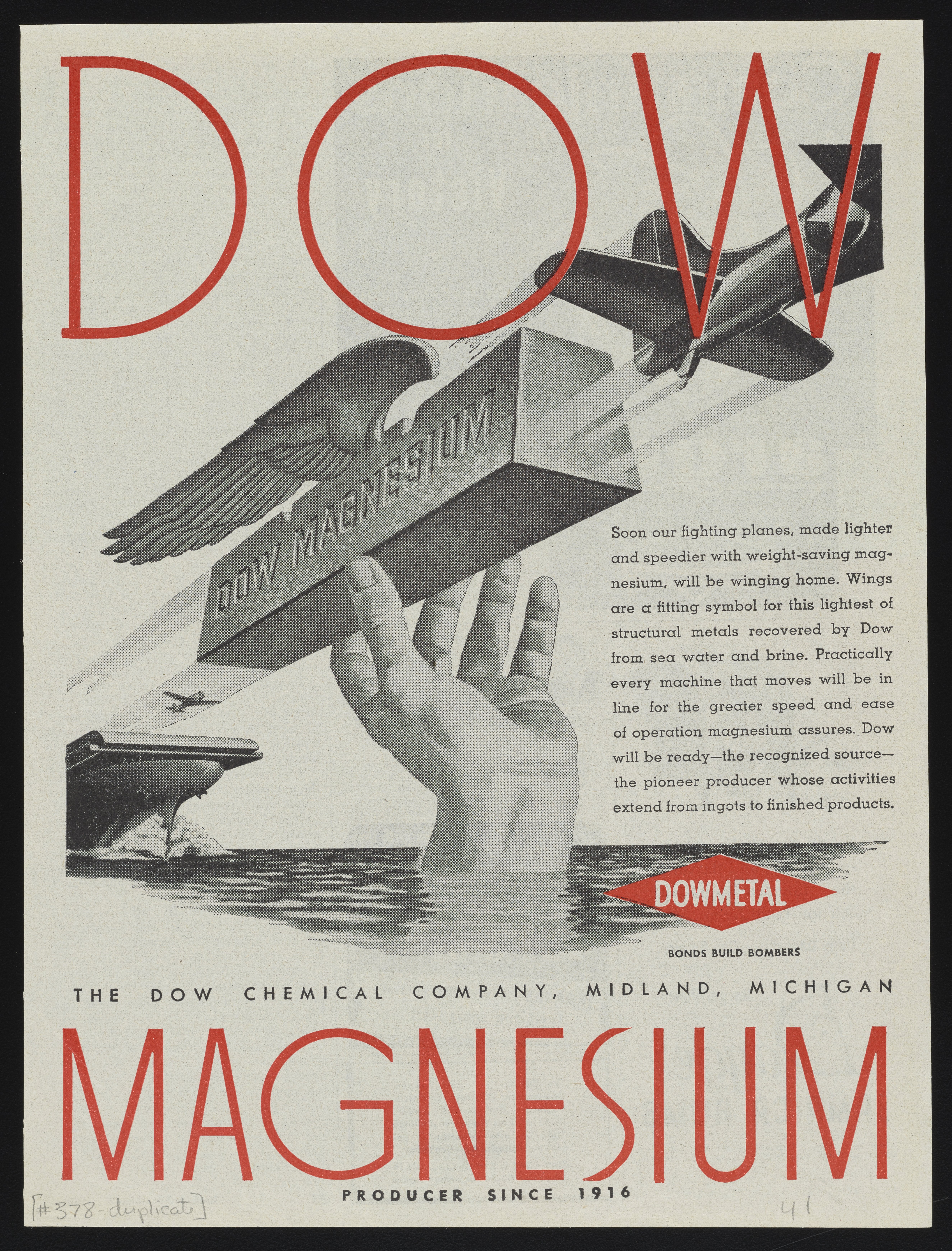Dow Chemical Company. “Advertisement for Dowmetal Magnesium,” November 22, 1943. Advertisements from the Dow Chemical Historical Collection, Box 8. Science History Institute. Philadelphia. https://digital.sciencehistory.org/works/oln3aj9.