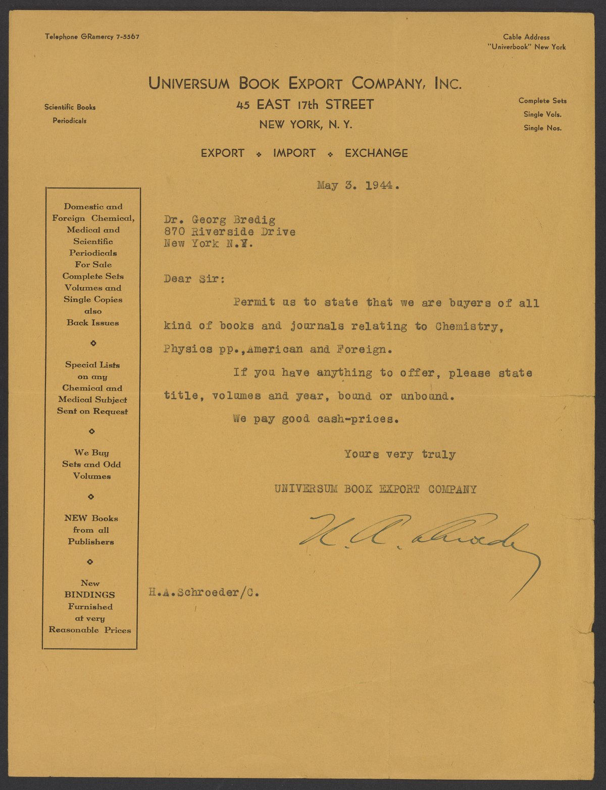 Schroeder, H. A. “Letter from Universum Book Export Company to Georg Bredig,” May 3, 1944. Papers of Georg and Max Bredig, Box 2, Folder 60. Science History Institute. Philadelphia. https://digital.sciencehistory.org/works/om766dx.