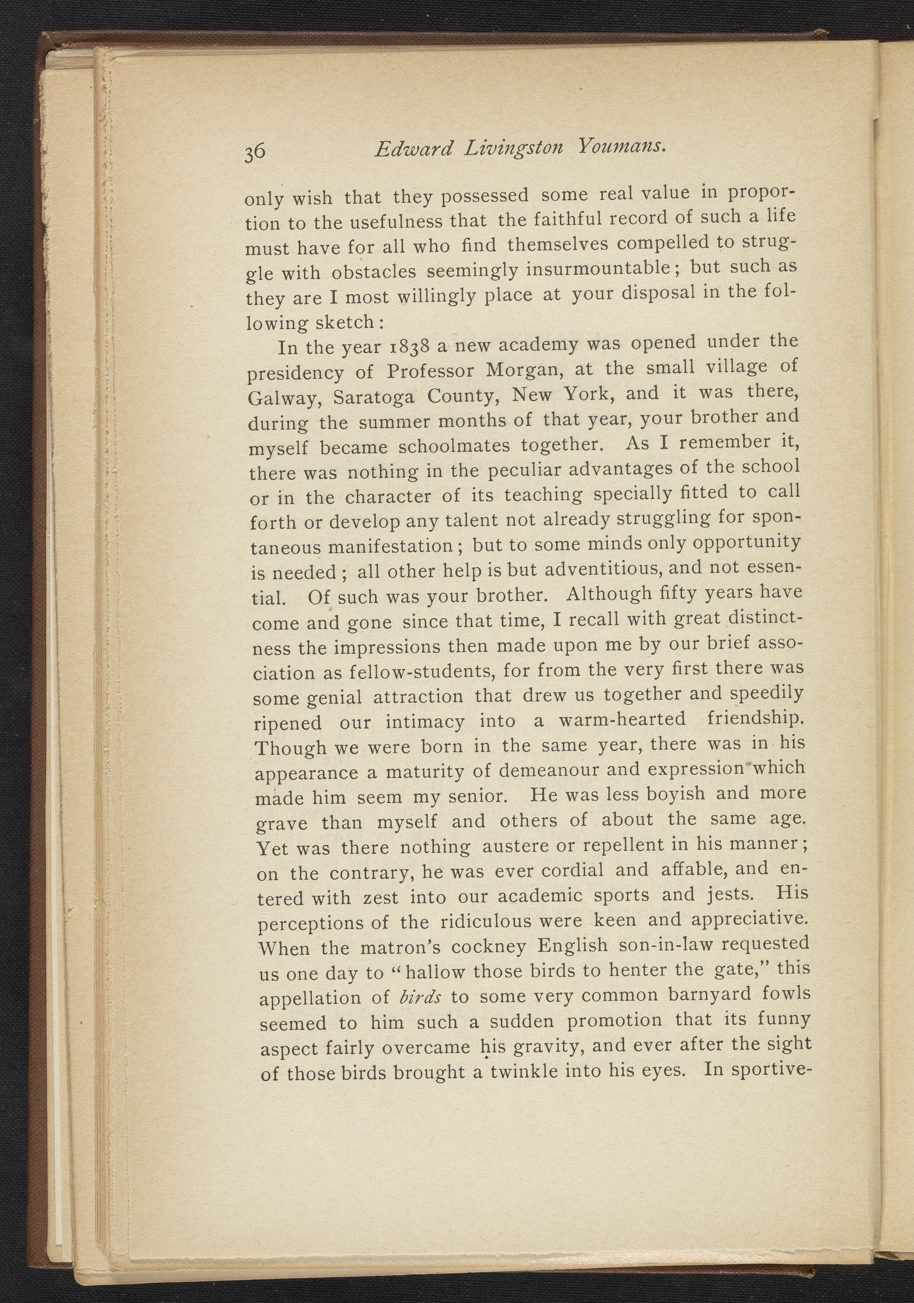 Small JPG1200 x 1737px — 407 KBLarge JPG2880 x 4168px — 2.4 MBFull-sized JPG3534 x 5115px — 3.5 MBOriginal fileTIFF — 3534 x 5115px — 51.8 MBBiography of American scientific writer, editor and lecturer Edward Livingston Youmans (1821-1887) who founded Popular Science magazine. Youman experienced partial blindness at age 17, which lasted until he was about 30 years old. The front matter and chapters on his blindness have been digitized from this book.