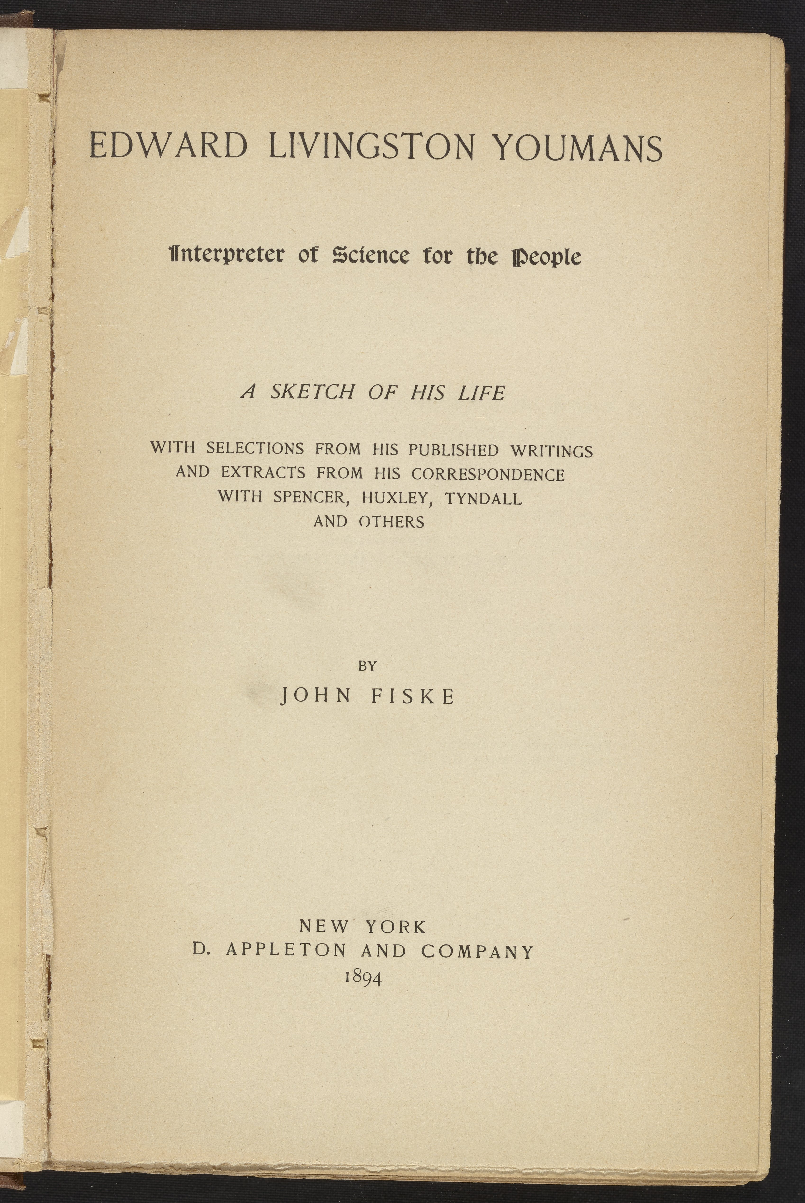 Fiske, John. “Edward Livingston Youmans, Interpreter of Science for the People.” New York, New York: D. Appleton and Company, 1894. https://digital.sciencehistory.org/works/onqobhe.