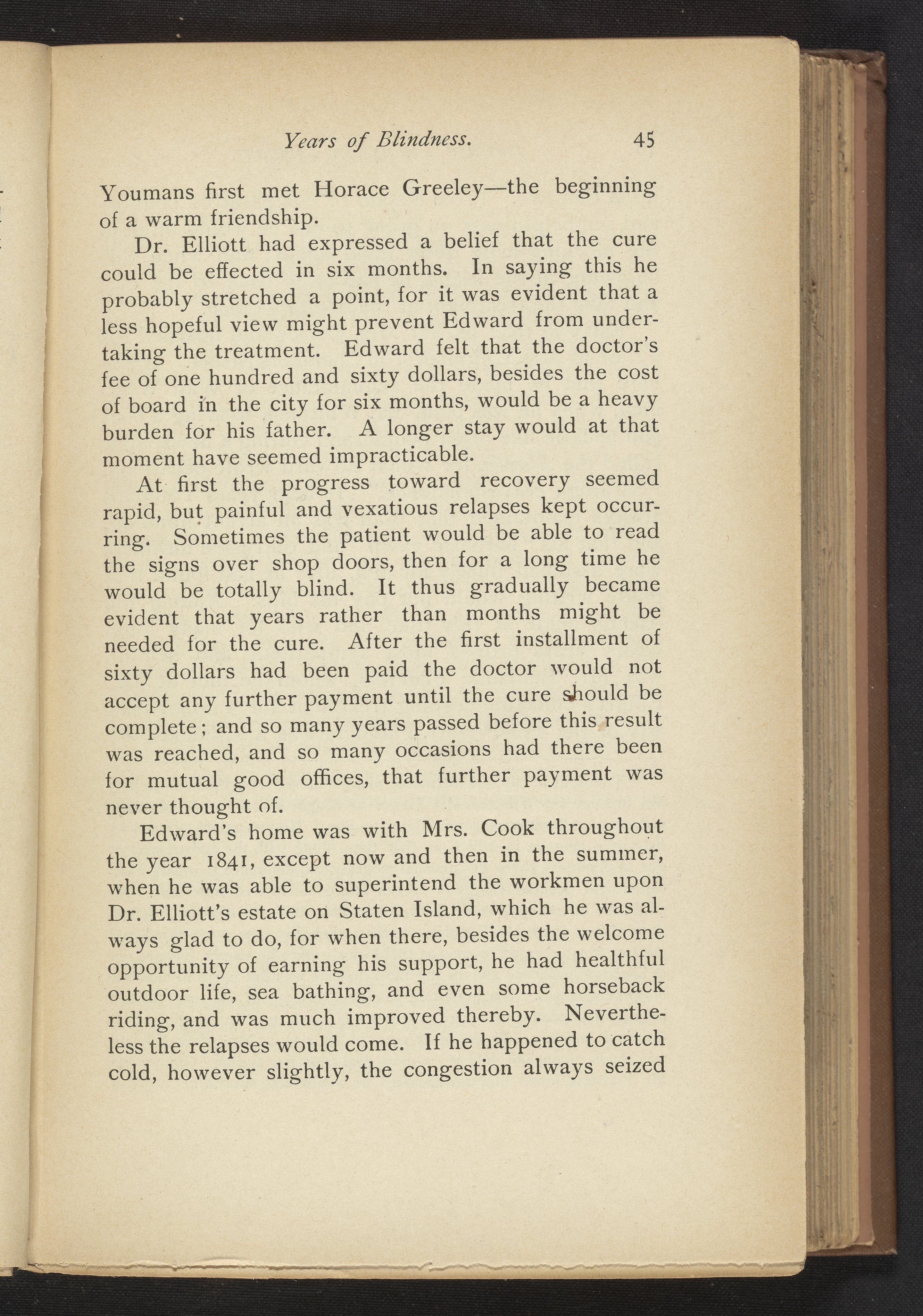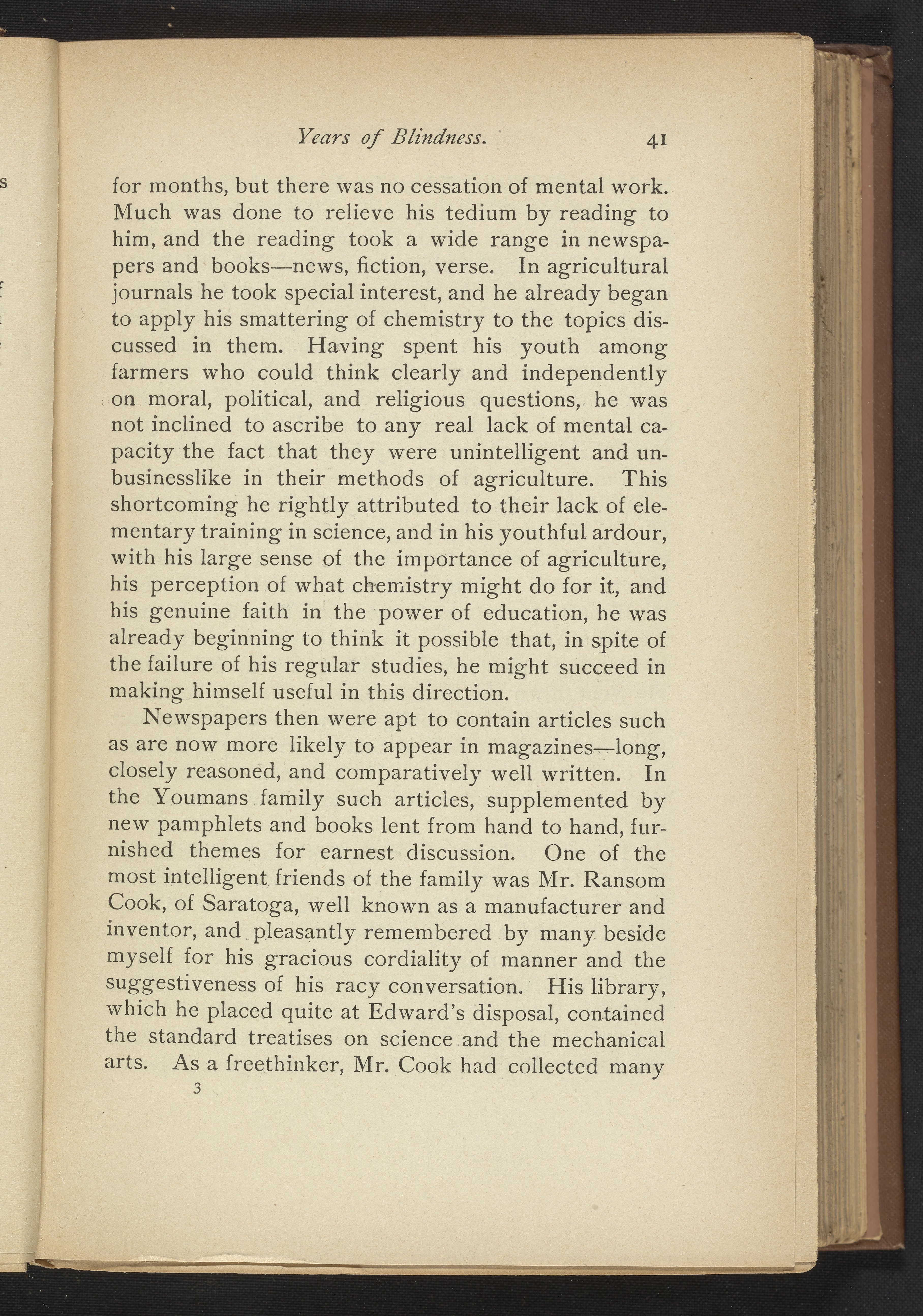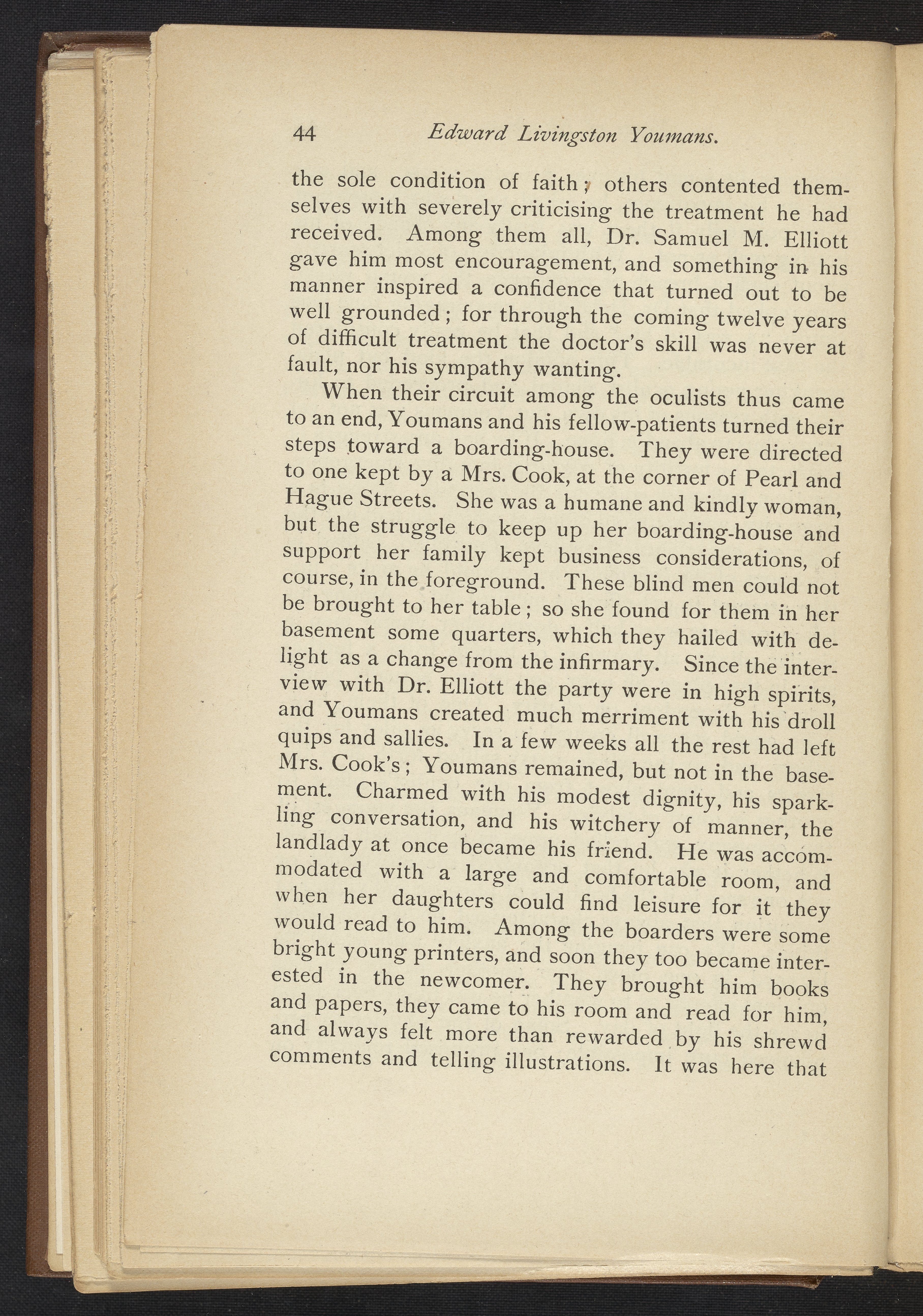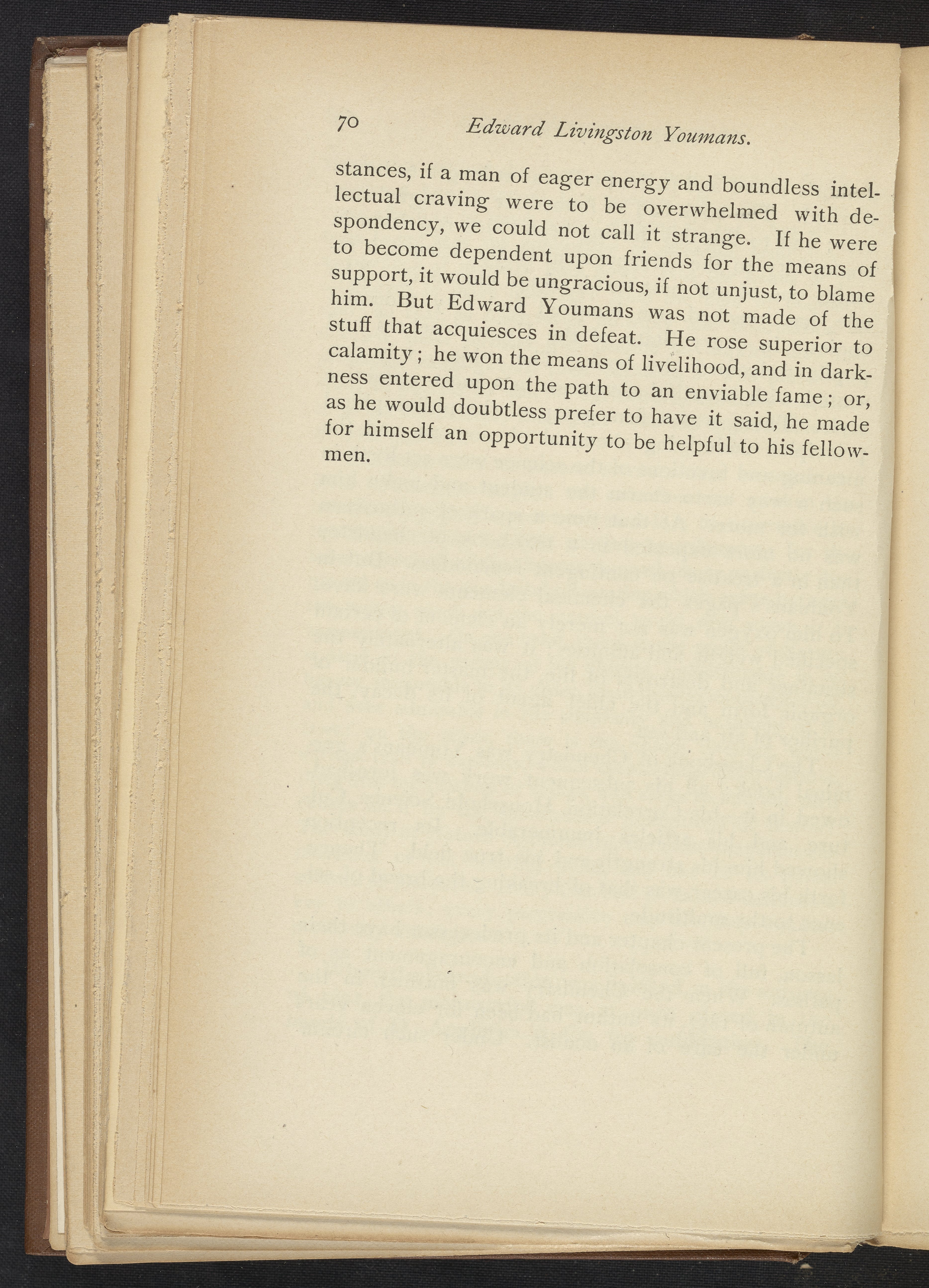 Small JPG1200 x 1737px — 407 KBLarge JPG2880 x 4168px — 2.4 MBFull-sized JPG3534 x 5115px — 3.5 MBOriginal fileTIFF — 3534 x 5115px — 51.8 MBBiography of American scientific writer, editor and lecturer Edward Livingston Youmans (1821-1887) who founded Popular Science magazine. Youman experienced partial blindness at age 17, which lasted until he was about 30 years old. The front matter and chapters on his blindness have been digitized from this book.