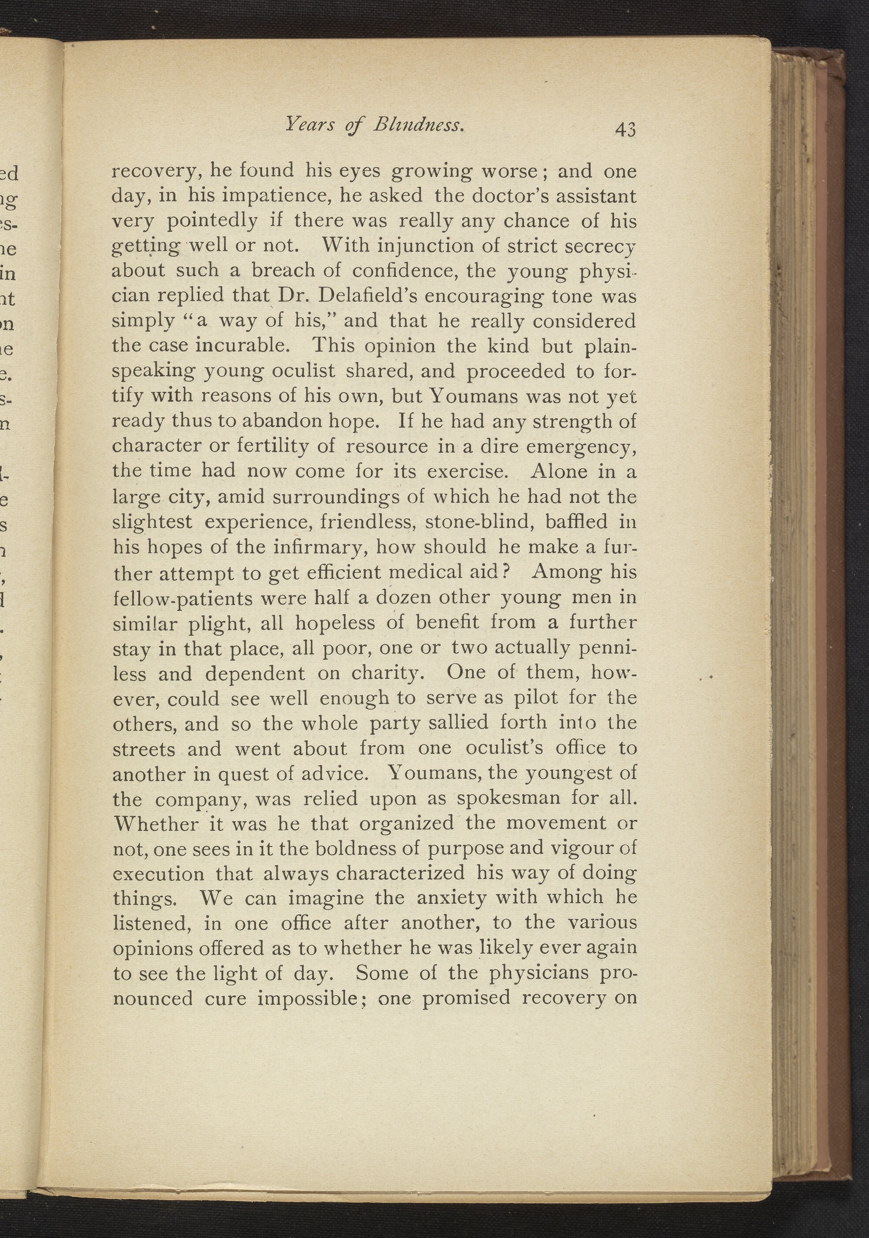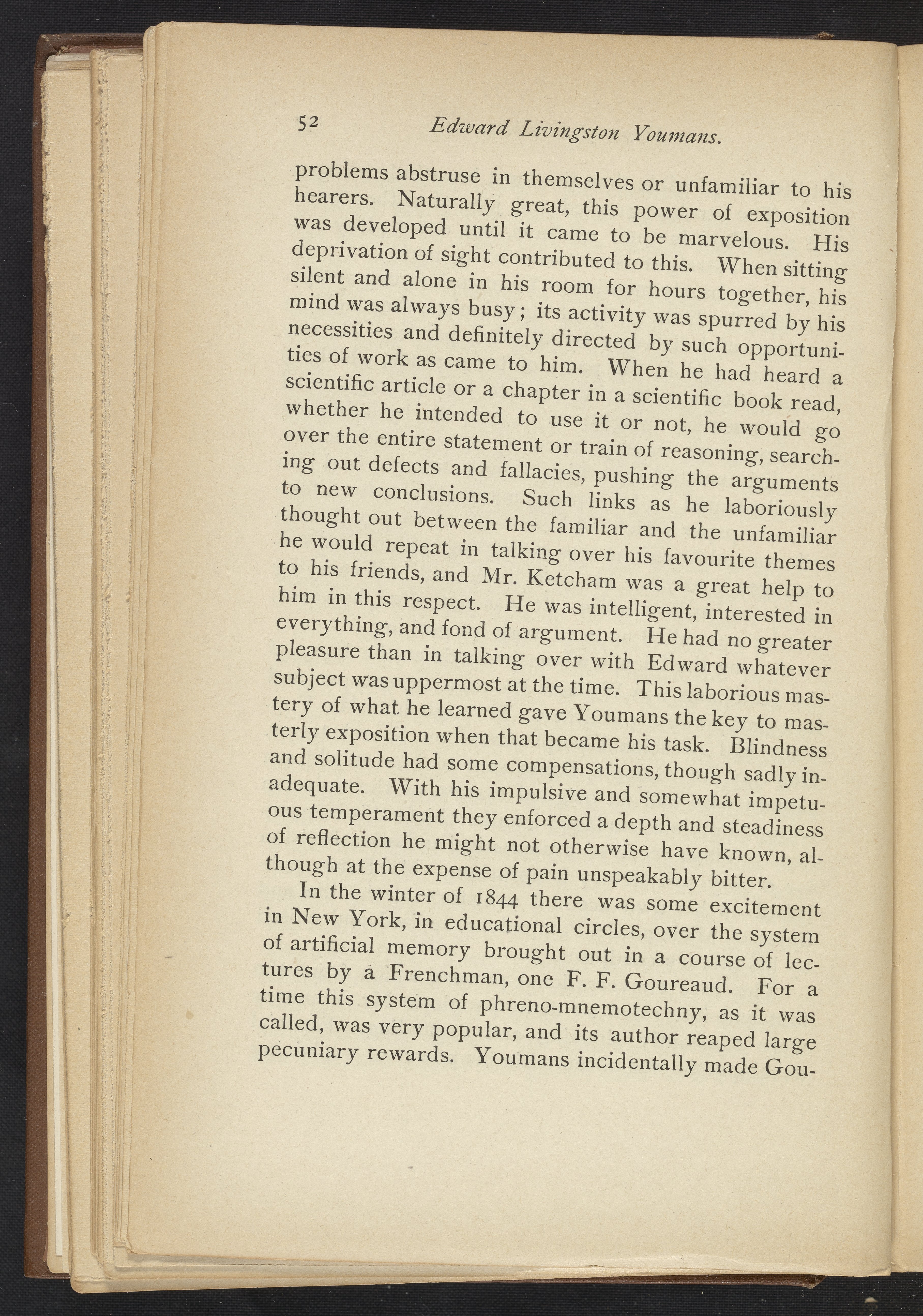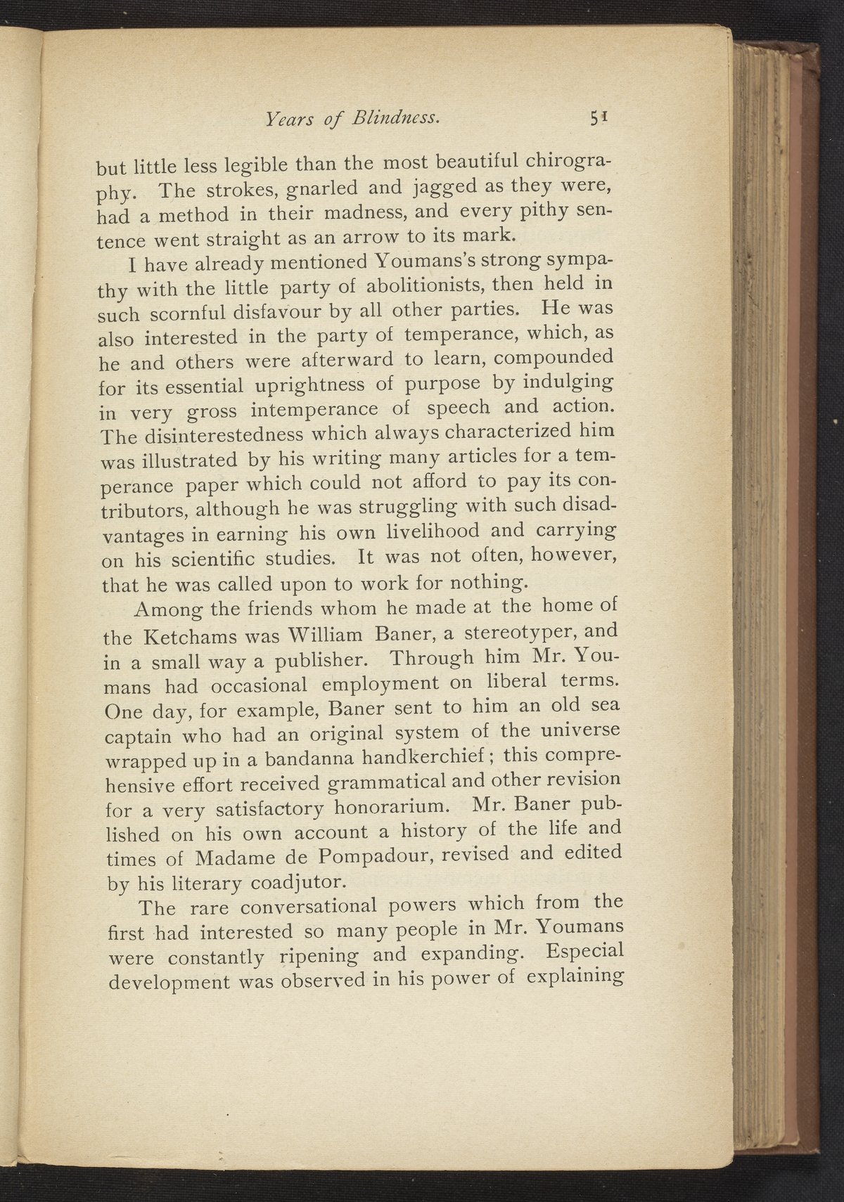 Small JPG1200 x 1737px — 407 KBLarge JPG2880 x 4168px — 2.4 MBFull-sized JPG3534 x 5115px — 3.5 MBOriginal fileTIFF — 3534 x 5115px — 51.8 MBBiography of American scientific writer, editor and lecturer Edward Livingston Youmans (1821-1887) who founded Popular Science magazine. Youman experienced partial blindness at age 17, which lasted until he was about 30 years old. The front matter and chapters on his blindness have been digitized from this book.