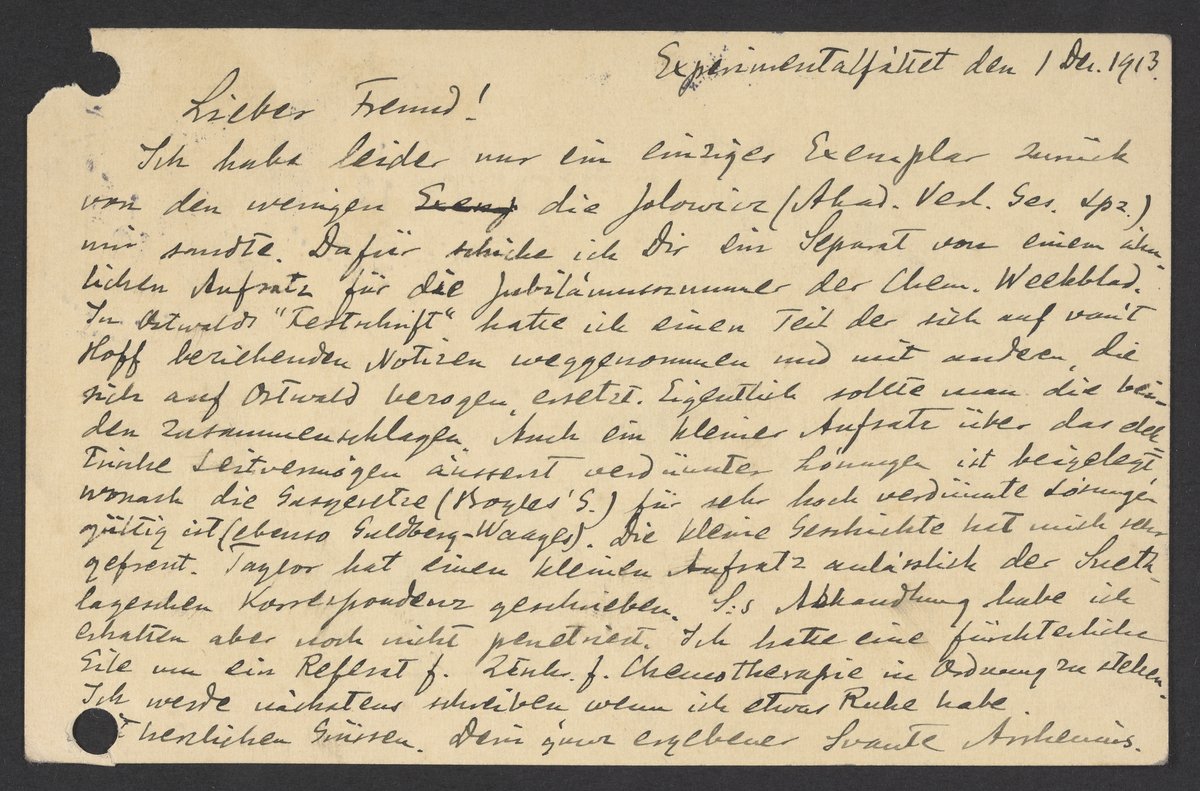 Ich habe leider nur ein einziges Exemplar zurück von den wenigen Exemp die Jalowicz (Akad. Verl. Ges. Sp. 2) mir sandte. Dafür schicke ich Dir ein Separat von einem ähnlichen Aufsatz für die Jubiläumsnummer der Chem. Weekblad. In Ostwalds „Festschrift“ hatte ich einen Teil der sich auf van’t Hoff beziehenden Notizen wegegnommen und anderen, die sich auf Ostwald verzogen, ersetzt. Eigentlich sollte man die beiden zusammenschlagen. Auch ein kleiner Aufsatz über das elektrische Leitvermögen äussert und Müster Lösungen ist beigelegt, wonach die Gasgesetze (Boyle’s) für sehr hoch verdünnte Lösungen gültig ist (ebenso Guldberg-Waages). Die kleine Geschichte hat mich sehr gefreut. Taylor hat einen keinen Aufsatz anlässlich der Snethlageschen Korrespondenz geschrieben. P.S: Abhandlung habe ich erhalten aber noch nicht pentriert. Ich hatte eine fürchterliche Eile ein Refereat f. Zenter der Chemotherapie in Ordnung zu stehen. Ich werde nächstens schreiben, wenn ich etwas Ruhe habe, Mit herzlichen Grüssen. Dein ganz ergebener Svante Arrhenius