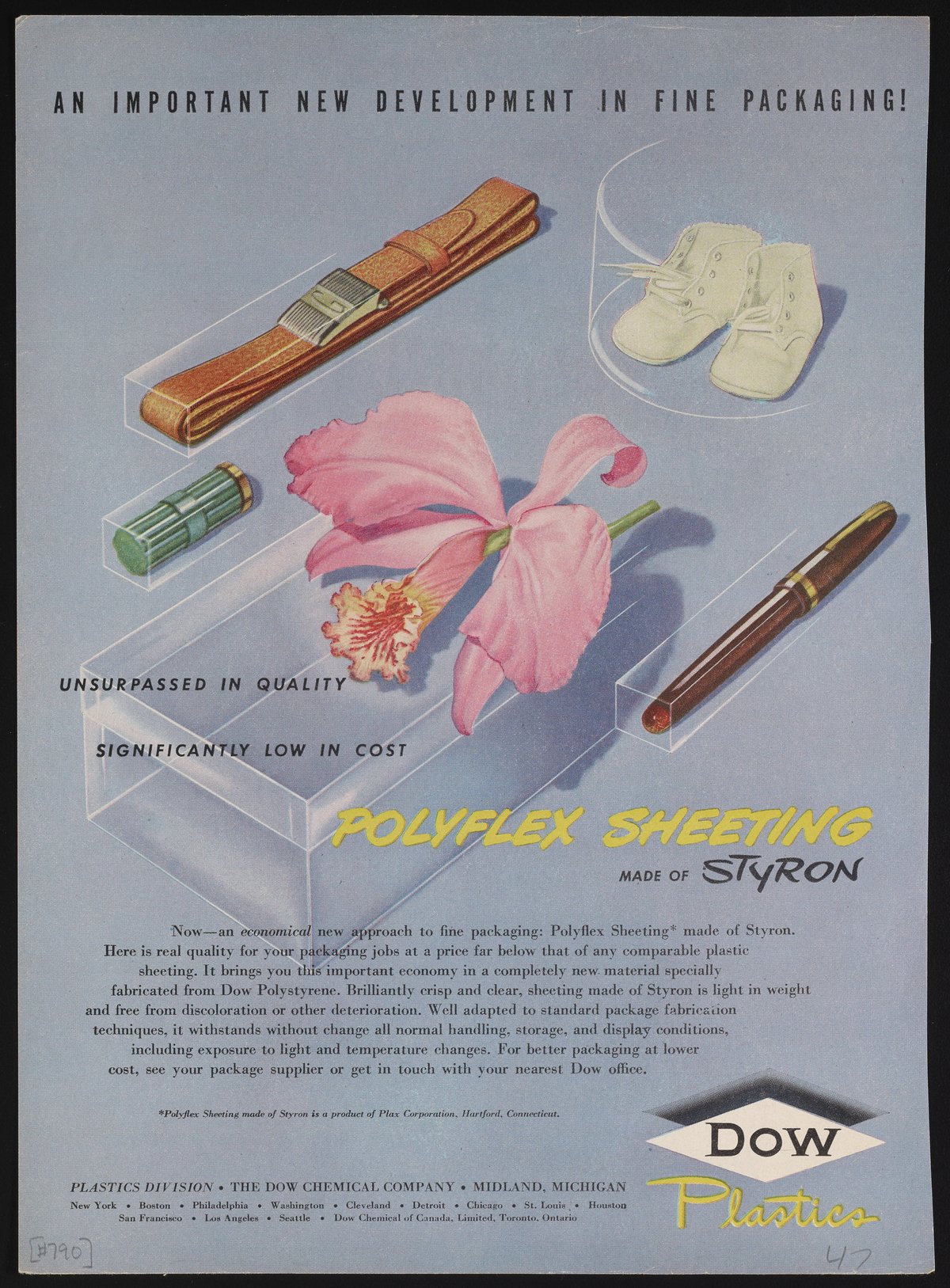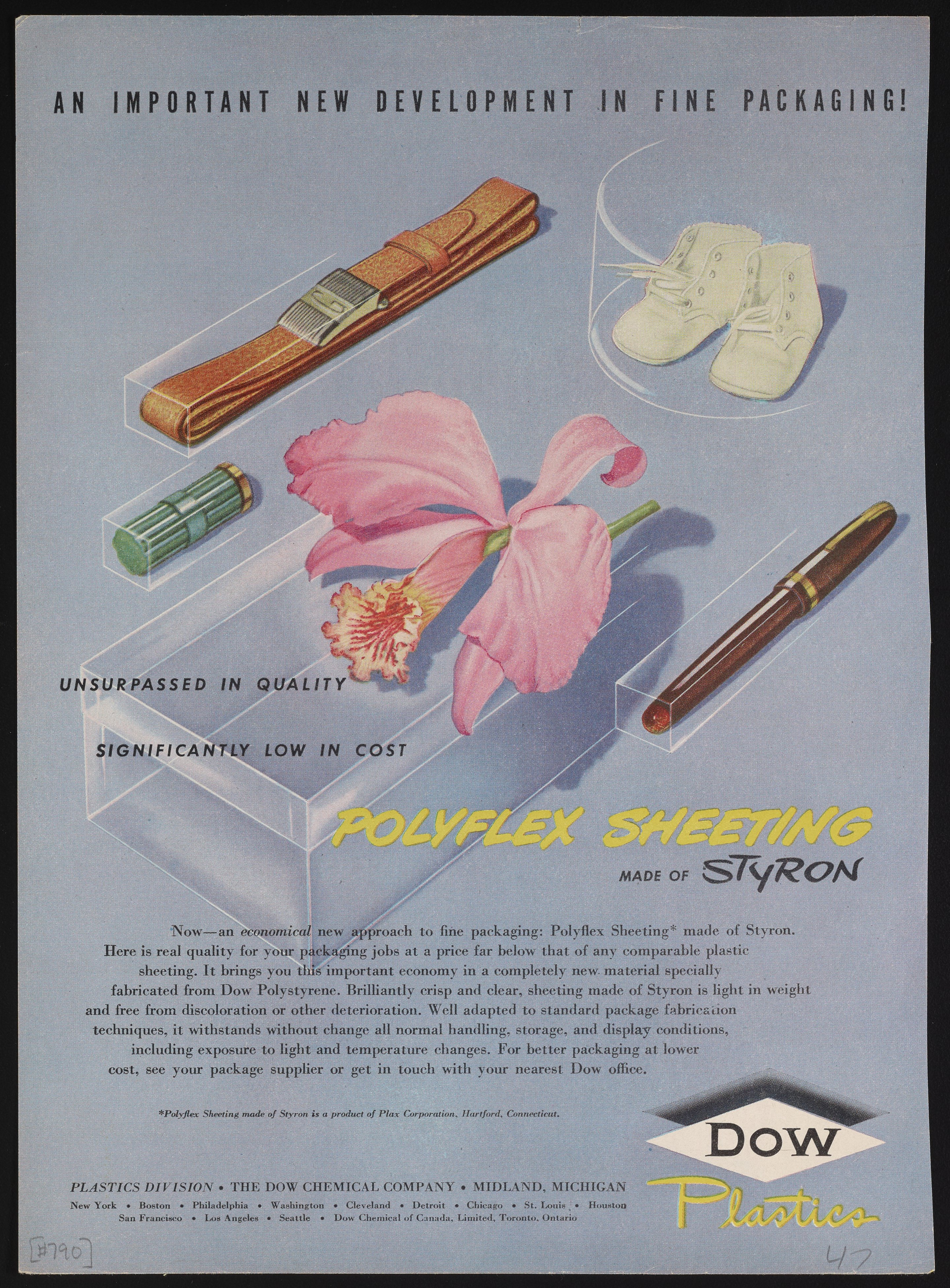 Dow Chemical Company. “An Important New Development in Fine Packaging!,” circa 1947. Advertisements from the Dow Chemical Historical Collection, Box 9. Science History Institute. Philadelphia. https://digital.sciencehistory.org/works/oo9v163.