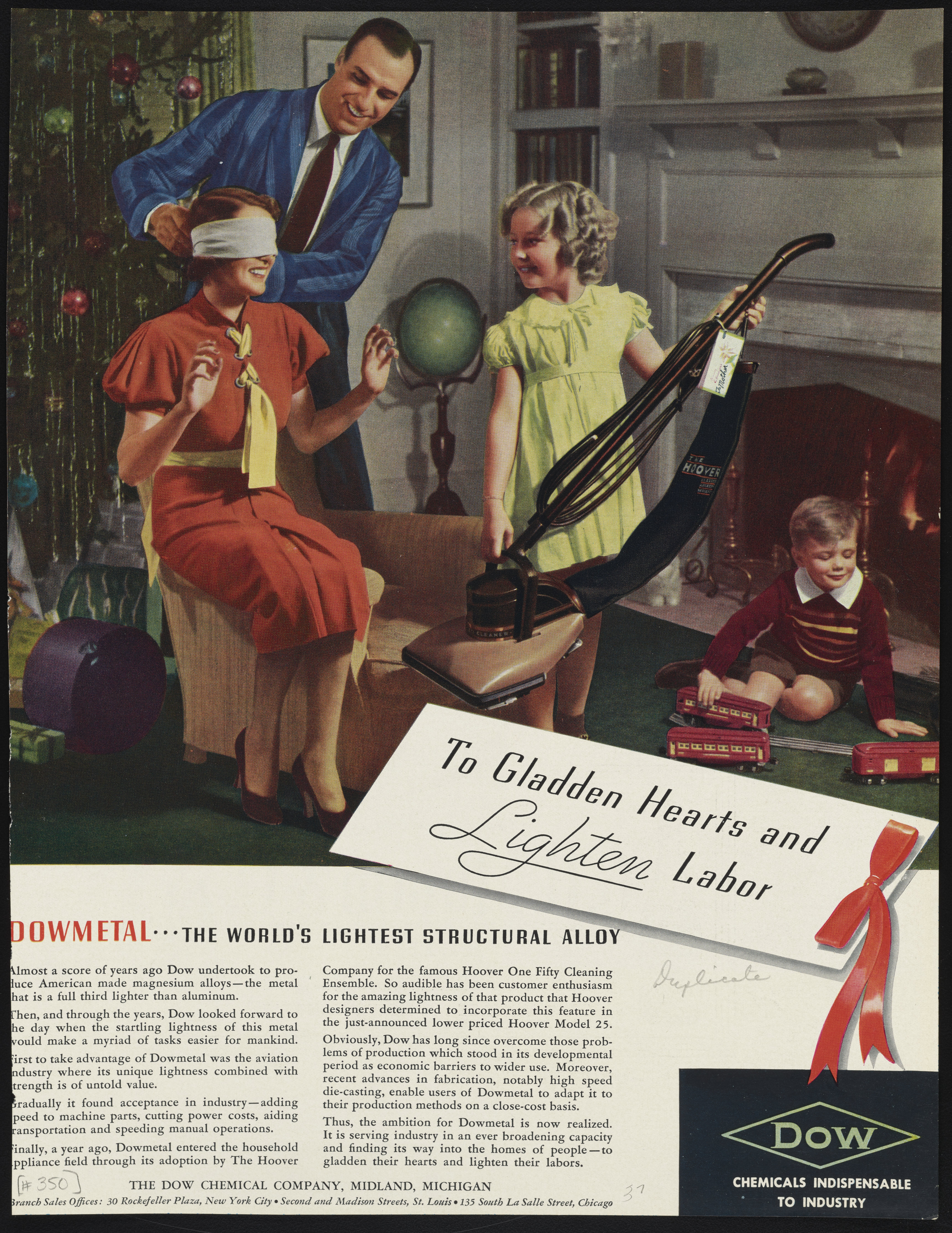 Color print advertisement for Dowmetal, a magnesium alloy manufactured and sold by the Dow Chemical Company. The advertisement features a scene of a family at Christmastime and focuses on a daughter presenting her mother with a Hoover vacuum cleaner made from Dowmetal. The accompanying text details the use of Dowmetal in a number of industries, including aviation, machinery, and household appliances, and emphasizes the product's lightness and durability relative to other structural metals.