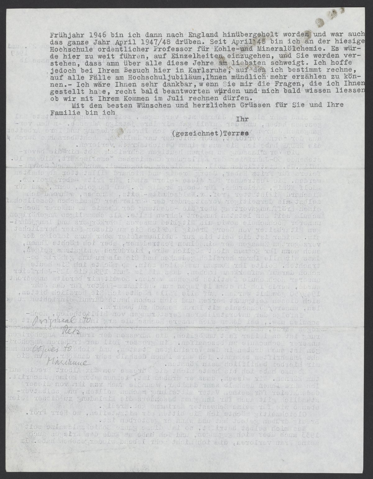 Im Frühjahr 1946 bin ich dann nach England hinübergeholt worden und war auch das ganze Jahr April 1947/48 drüben. Seit April 48 bin ich an der hiesigen Hochschule ordentlicher Professor für Kohl-und Mineralölchemie. Es würde hier zu weit führen auf Einzelheiten einzugehen, und Sie werden verstehen, dass man über alle diese Jahre am liebsten schweigt. Ich hoffe jedoch bei Ihrem Besuch hier in Karlsruhe, auf den ich bestimmt rechne, auf alle Fälle an Hochschuljubiläum, Ihnen mündlich mehr erzählen zu können. – Ich wäre Ihnen sehr dankbar, wenn Sie mir die Fragen, die ich Ihnen gestellt habe, recht bald beantworten würden und mich bald wissen liessen, ob wir mit Ihrem Kommen im Juli rechnen dürfen.