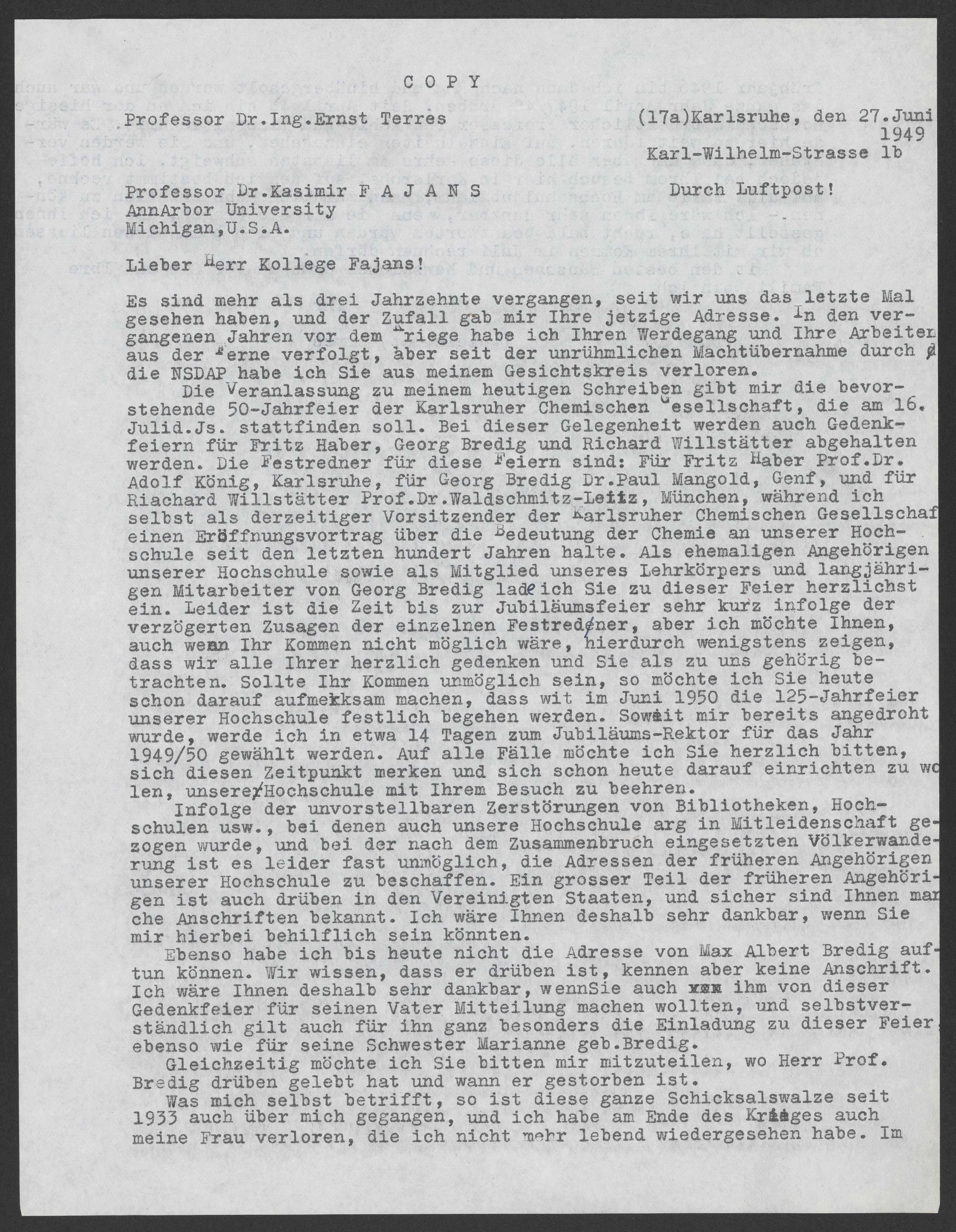 Die Veranlassung zu meinem heutigen Schreiben gibt mir die bevorstehende 50-Jahrfeier der Karlsruher Chemischen Gesellschaft, die am 16. Juli d.Js. stattfinden soll. Bei dieser Gelegenheit werden auch Gedenkfeier für Fritz Haber, Georg Bredig und Richard Willstätter abgehalten werden. Die Festredner für diese Feiern sind: Für Fritz Haber Prof. Dr. Adolf König, für Georg Bredig Dr. Paul Mangold, Genf, und für Richard Willstätter Prof. Dr. Waldschmitz-Leitz, München, während ich selbst als derzeitiger Vorsitzender der Karlsruher Chemischen Gesellschaft einen Eröffnungsvortrag über die Bedeutung der Chemie an unserer Hochschule seit den letzten hundert Jahren halte. Als ehemaligen Angehörigen unserer Hochschule sowie als Mitglied unseres Lehrkörpers und langjährigen Mitarbeiter von Georg Bredig lade ich Sie zu dieser Feier herzlichst ein. Leider ist die Zeit bis zur Jubiläumsfeier sehr kurz infolge der verzögerten Zusagen der einzelnen Festredner, aber ich möchte Ihnen, auch wenn Ihr Kommen nicht möglich wäre, hierdurch wenigstens zeigen, dass wir alle Ihrer herzlich gedenken und Sie als zu uns gehörig betrachten. Sollte Ihr Kommen unmöglich sein, so möchte ich Sie heute schon darauf aufmerksam machen, dass wir im Juni 1950 die 125-Jahrfeier unserer Hochschule festlich begehen werden. Soweit mir bereits angedroht wurde, werde ich in etwa 14 Tagen zum Jubiläums-Rektor für das Jahr 1949/50 gewählt werden. Auf alle Fälle möchte ich Sie herzlich bitten, sich diesem Zeitpunkt merken und sich schon heute darauf einrichten zu wollen, unsere Hochschule mit Ihrem Besuch zu beehren.
