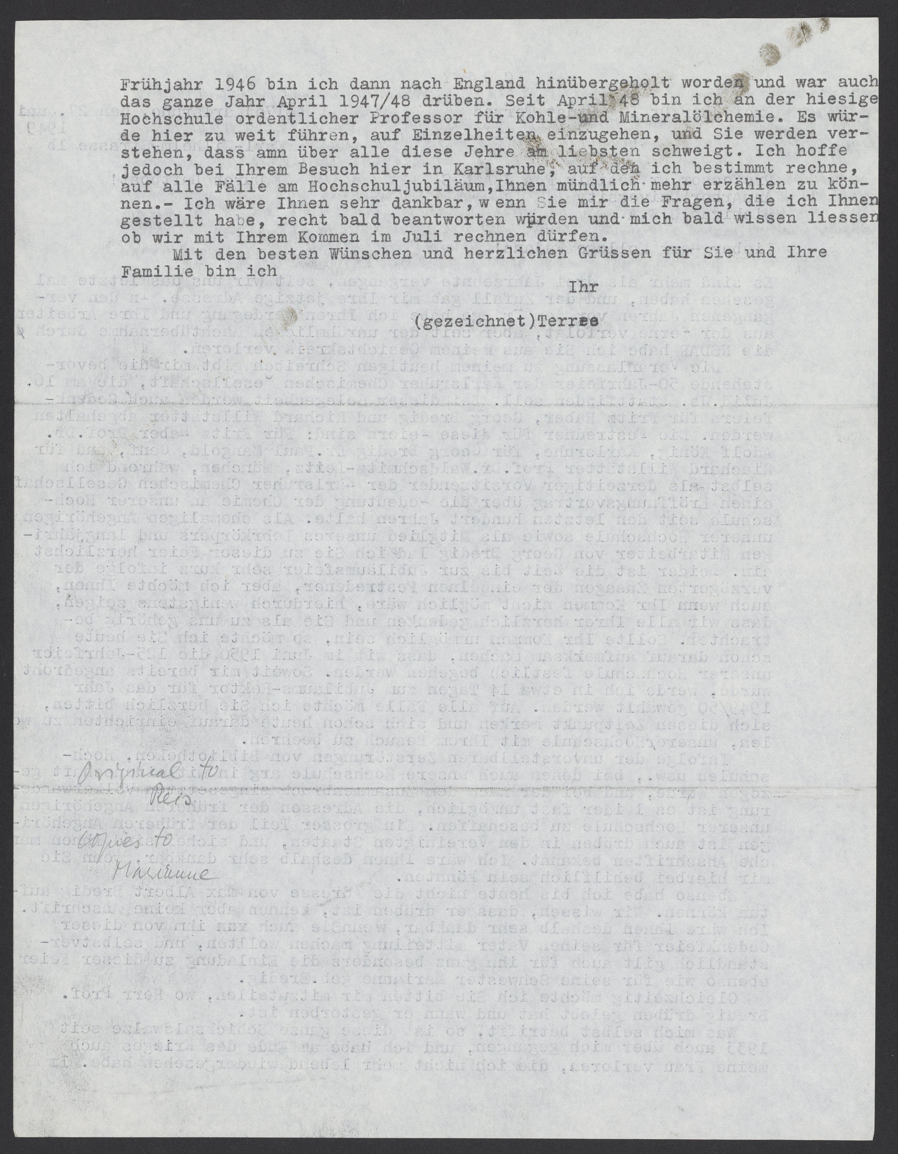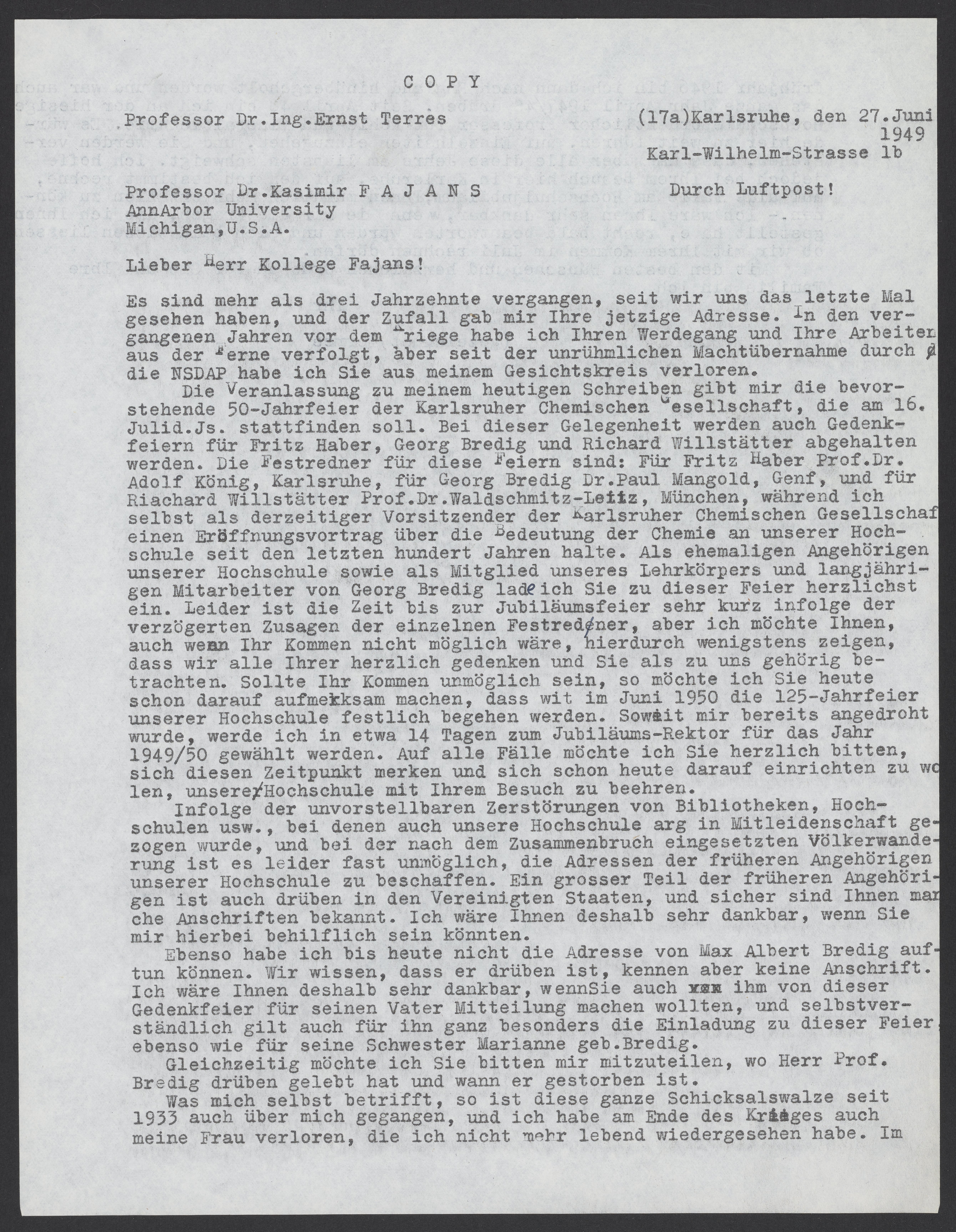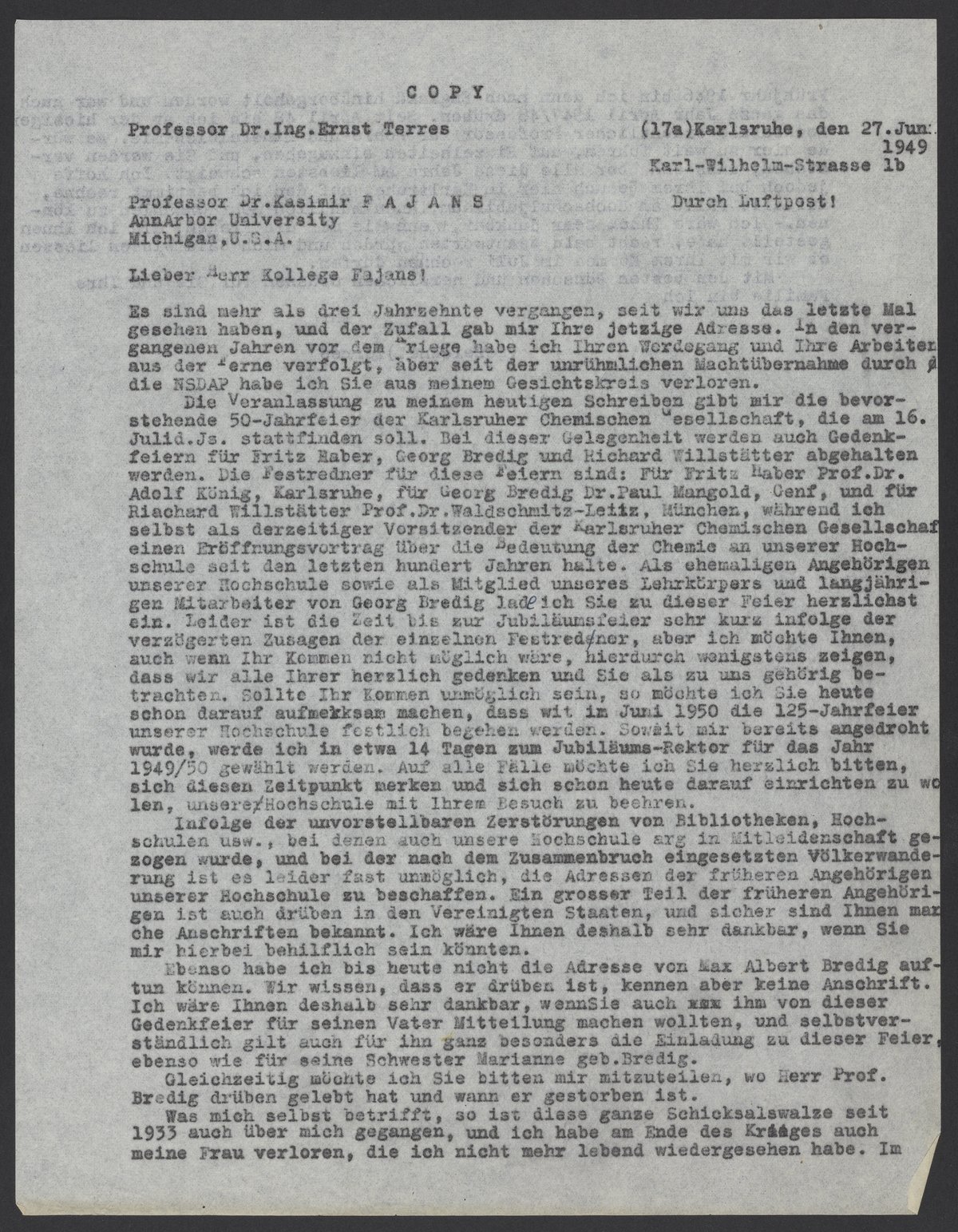 Letter from Ernst Terres to Kasimir Fajans, June 27, 1949